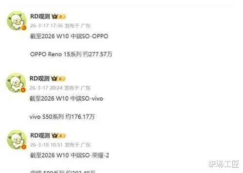 根据第三方监测机构“RD观测”最新数据,截至第10周,Reno15系列累计销量已突破277.57万台,逼近280万大关。相较之下,荣耀500系列以203.49万台、vivo S50系列176.17万台的体量紧随其后。