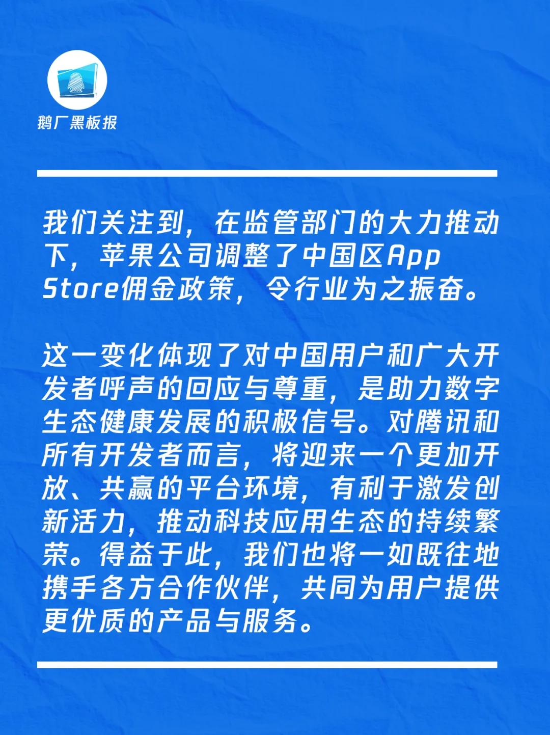 腾讯旗下微信公众号“鹅厂黑板报”,在之后发出声明,表示“这一变化……是助力数字生态健康发展的积极信号。对腾讯和所有开发者而言,将迎来一个更加开放、共赢的平台环境……”