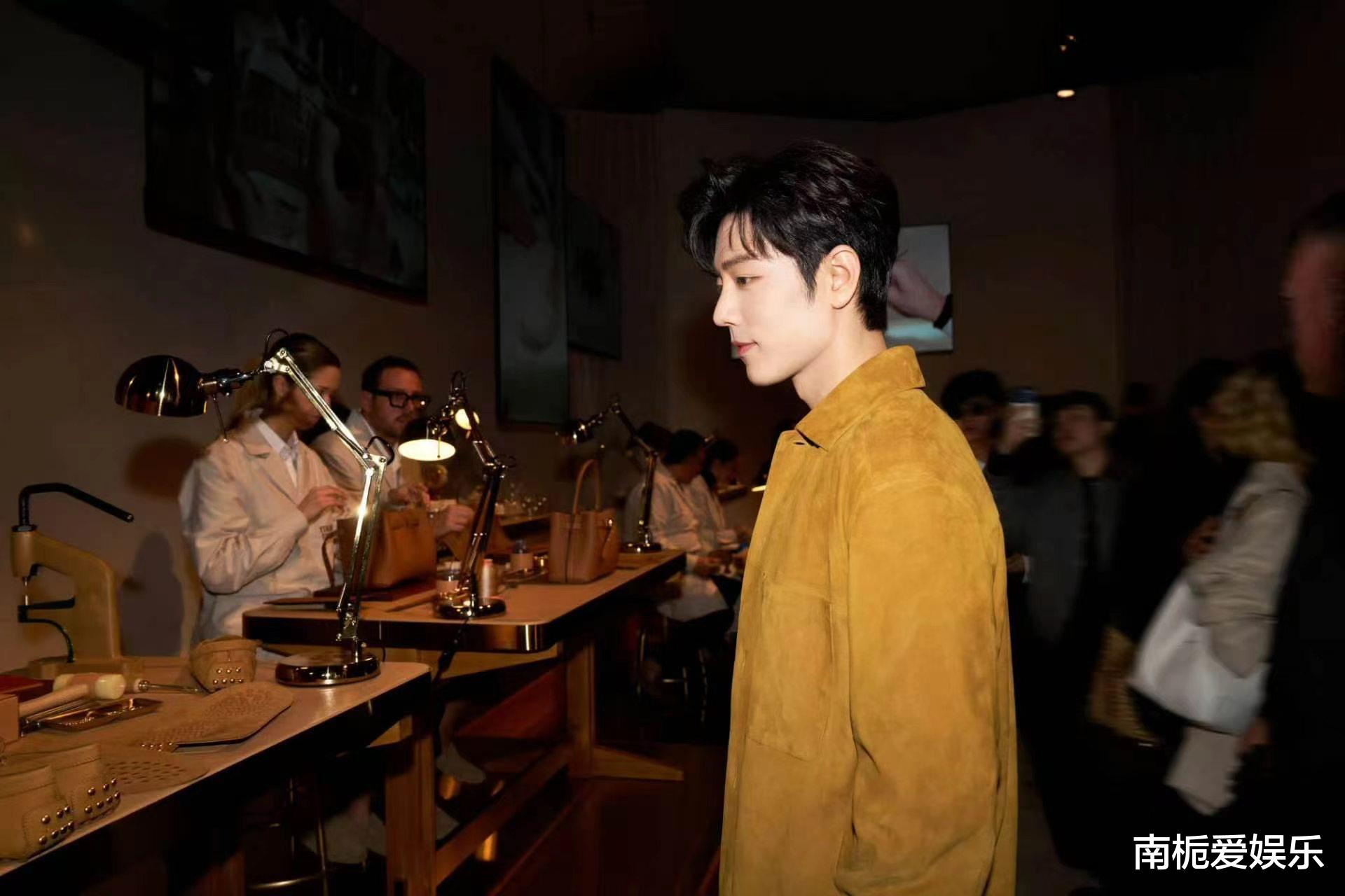 暖姜黄色麂皮衬衫外套宽松落肩,搭配深棕色直筒休闲裤与金属扣皮带,既保留利落线条又透着慵懒贵气;米白色高领针织衫贴合颈部线条,与外套形成“外松内紧”的层次美学。183cm的身高撑起利落剪裁,生图状态下五官立体、皮肤清透,被网友盛赞“生图比精修更有氛围感”。因秀场灯光高温,他频繁擦汗的自然反应,被粉丝调侃为“真实可爱的擦汗侠”,让高定秀多了几分生活化的亲切。