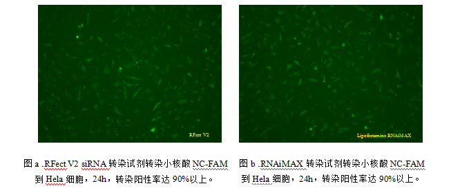 而第二代siRNA转染试剂通过创新递送技术与配方优化,在转染性能上实现了质的飞跃。以百代生物RFect V2为例,其采用新型可降解纳米材料作为递送载体,并配套研发了专属siRNA转染增强剂,两者搭配使用可帮助调节细胞膜表面的电荷分布与受体表达,有效抑制细胞对异源核酸的免疫排异反应,进一步促进了转染复合物与细胞膜的融合及胞内释放。大量实验数据表明,RFect V2在多种贴壁细胞(如Hela、HEK293、BEAS-2B等)中的mRNA敲除效率可高达95%左右,即便在Huvec、THP-1等难转染细胞中也能实现高效转染。另一款第二代试剂Lipofectamine RNAiMAX则通过优化脂质体成分配比,强化了与siRNA的结合效率及胞内释放能力,在低浓度siRNA条件下即可获得理想转染效果,不仅降低了高浓度siRNA可能引发的非特异性基因沉默效应,还提升了实验的特异性与可靠性,是目前国际公认的最为权威的一款siRNA转染试剂。在Hela细胞中进行的NC-FAM小核酸转染对比实验显示,RFect V2与RNAiMAX的转染效率均突破90%,可视化层面呈现出相当的转染效果。