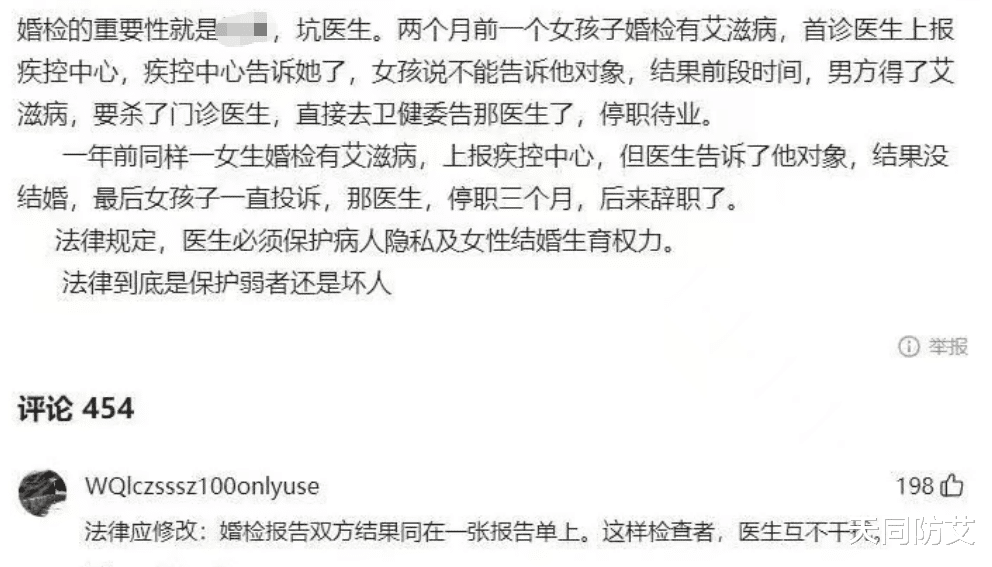 “一年前,也有一位婚检女性检测出艾滋病,医生上报疾控中心并主动告知她对象,结果双方未结婚,女方持续投诉,医生被停职三个月,之后辞职。”