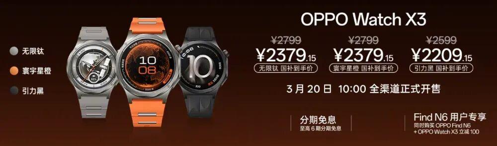 另外,活动中还带来了OPPO Watch X3,“引力黑”售价 2599 元,“寰宇星橙”、“无限钛”售价2799 元。