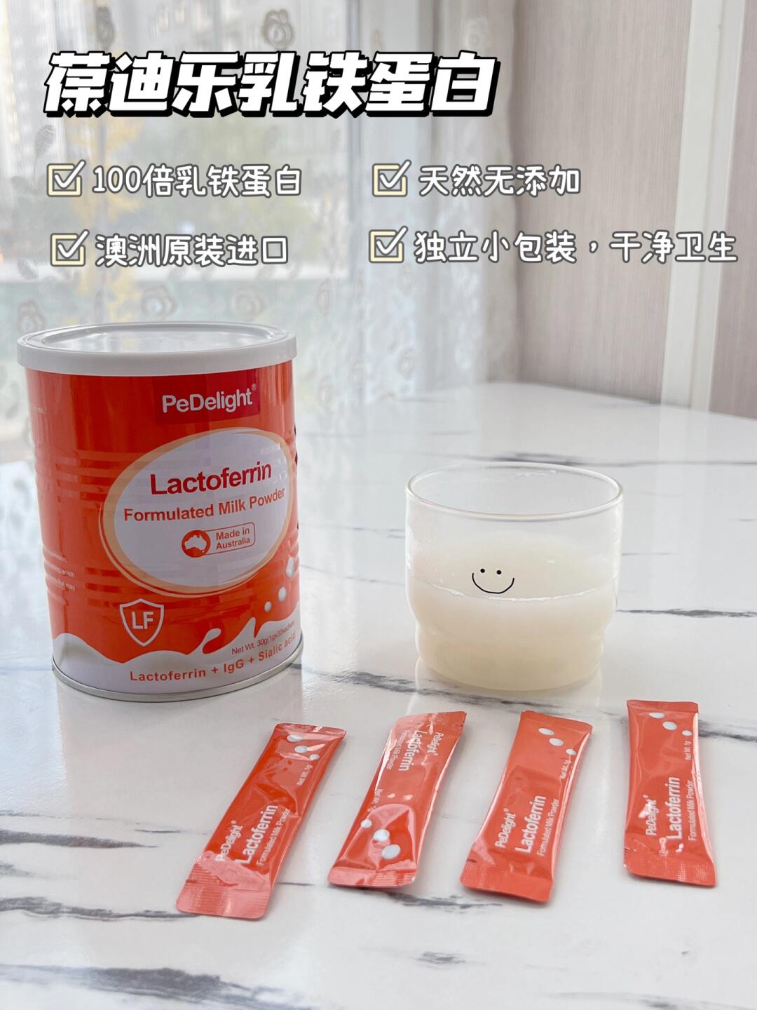 我家宝宝有点贫血,在补铁的时结合摄入乳铁蛋白,补铁效果事半功倍哦!粉状冲剂非常细腻好冲泡,平时用温水冲着喝或者加在牛奶、辅食里都可以的,淡淡的奶香味宝宝也非常爱喝~