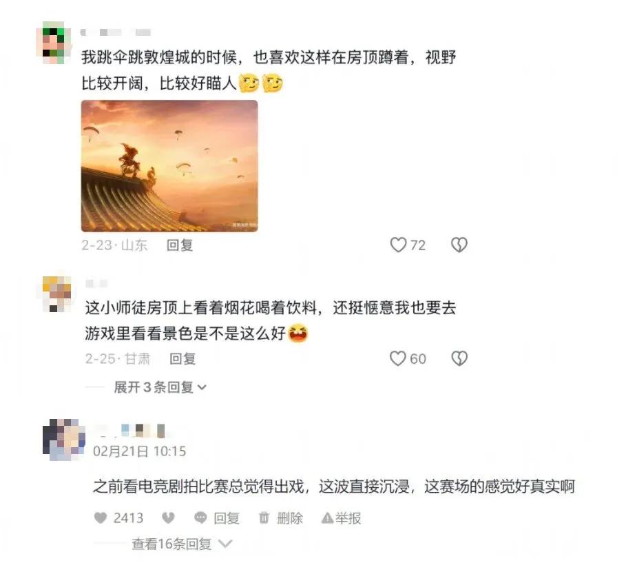 这些在场景上力求还原的努力,也得到了观众的热烈反馈。不少熟悉《和平精英》的玩家,会讨论男主在比赛中蹲守的位置,去打卡同款“敦煌烟花”场景。而高度贴近PEL赛事的电竞场景与氛围,也让许多观众沉浸其中。