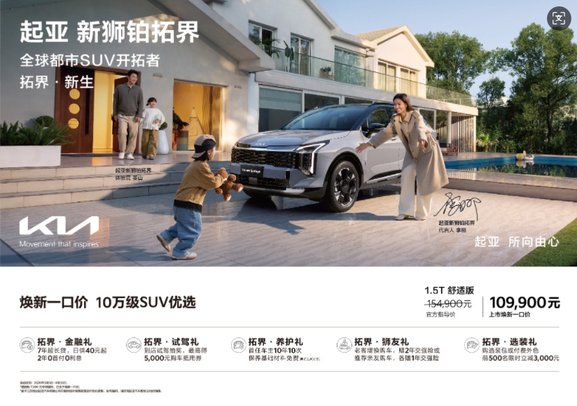 经典焕新,传奇再续。2026年3月5日,起亚新狮铂拓界正式上市,共推出7款车型,并在中国首次提供X-Line专属运动设计包,官方指导价15.49万元-21.79万元。为回馈广大中国用户的信赖,即日起至4月30日,消费者购车即享全国统一“焕新一口价”10.99万元起!同时还可享金融礼、试驾礼、养护礼、狮友礼、选装礼5大尊享礼遇。