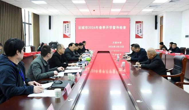 为全面检验春季开学各项工作筹备落实情况,压实办学治校责任,保障新学期教育教学工作平稳有序开展,3月9日,运城市教育局2026年春季开学督导组一行7人,在组长董兴华的带领下莅临万荣中学,开展专项督导检查。万荣县教体局副局长杨森、督导室负责人裴小军陪同检查。学校领导班子及相关科室负责人全程参与迎检工作。