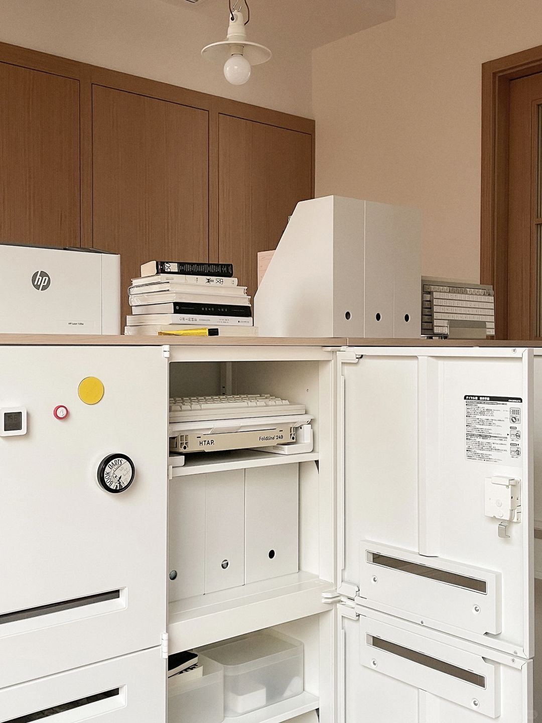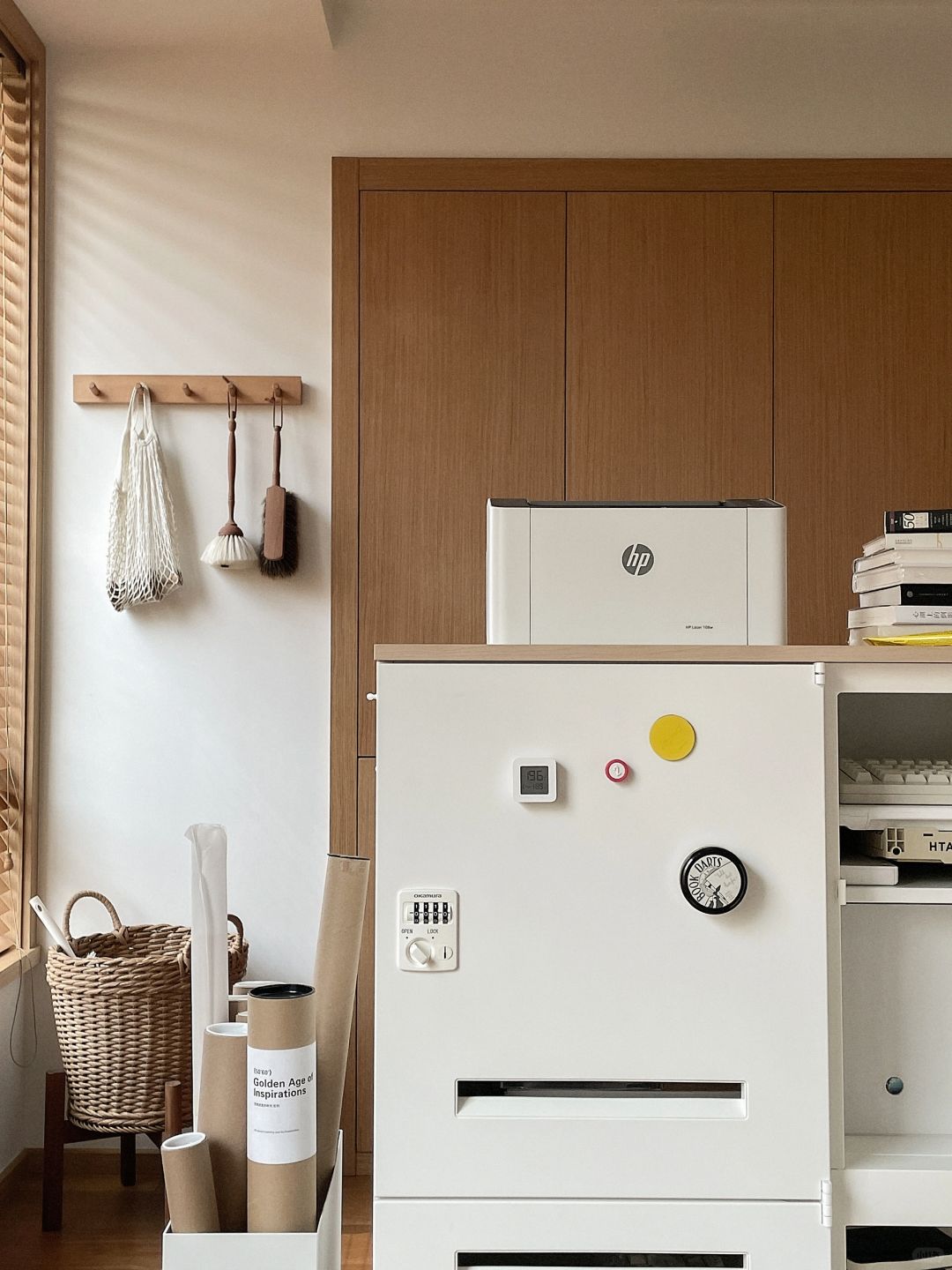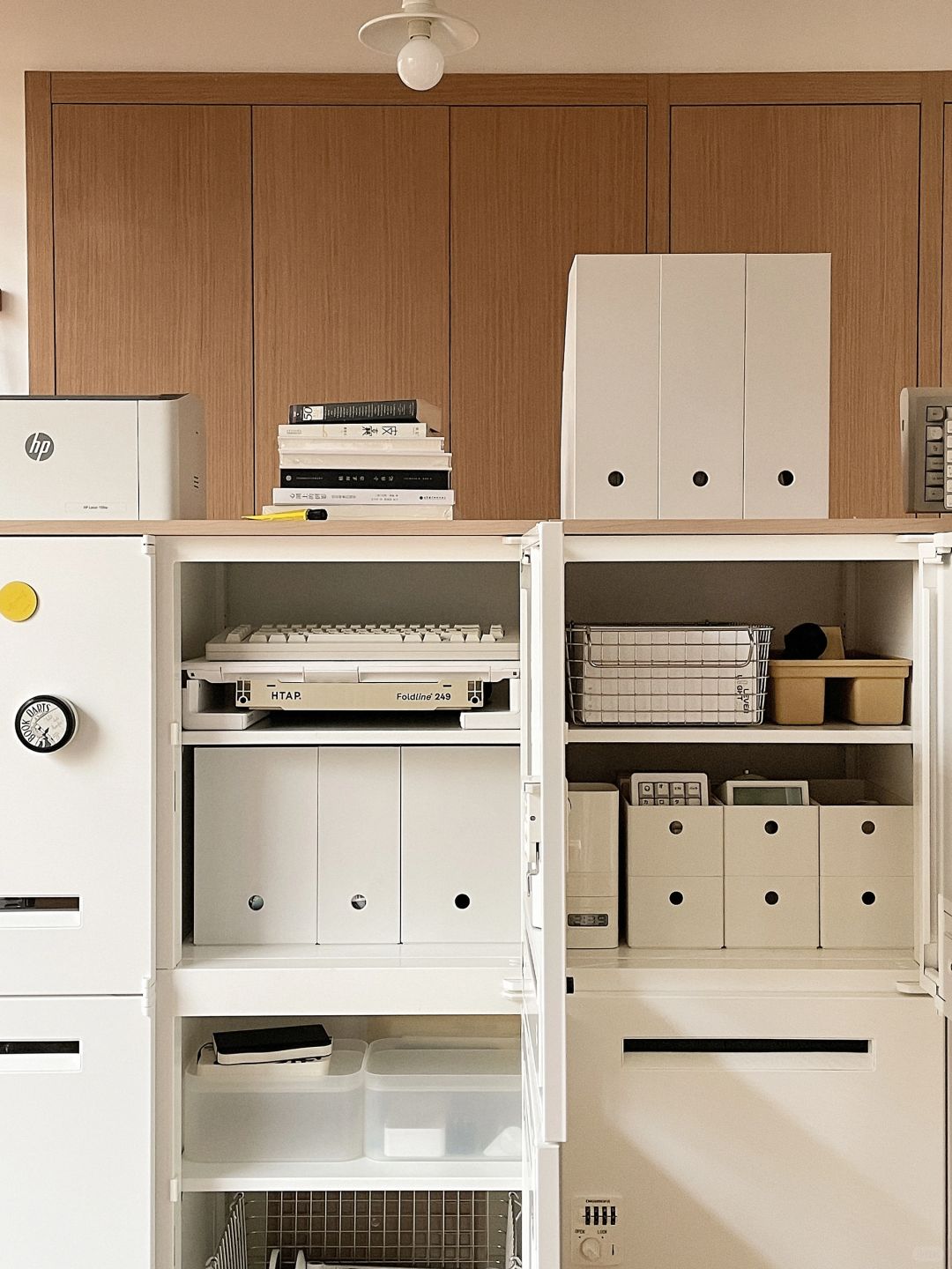 这样两只大白铁皮柜子, 兼具了颜值和收纳, 已经是书房的核心啦, 可以做书柜可以做杂物收纳, 简简单单的造型不翻车~ 用了一年依然是全屋zui爱!