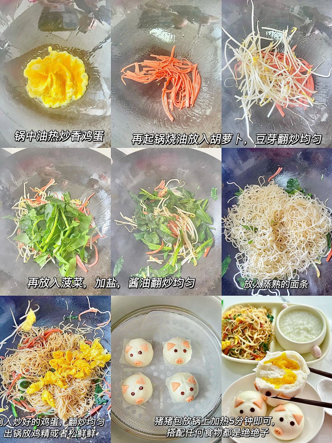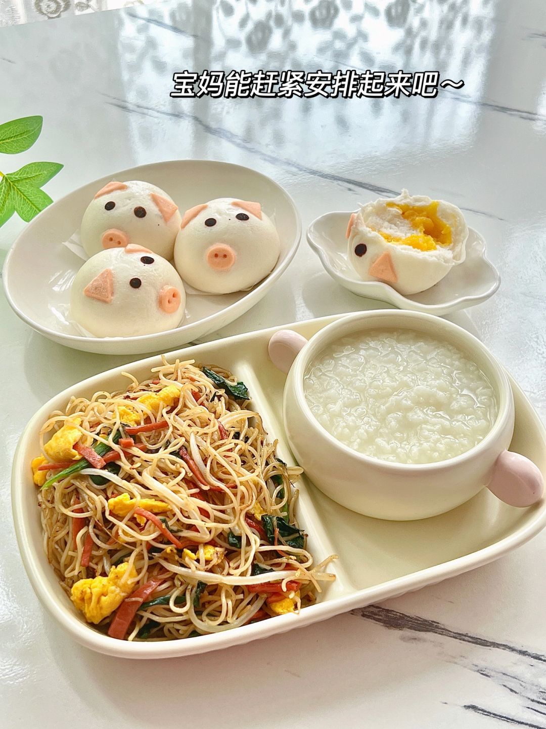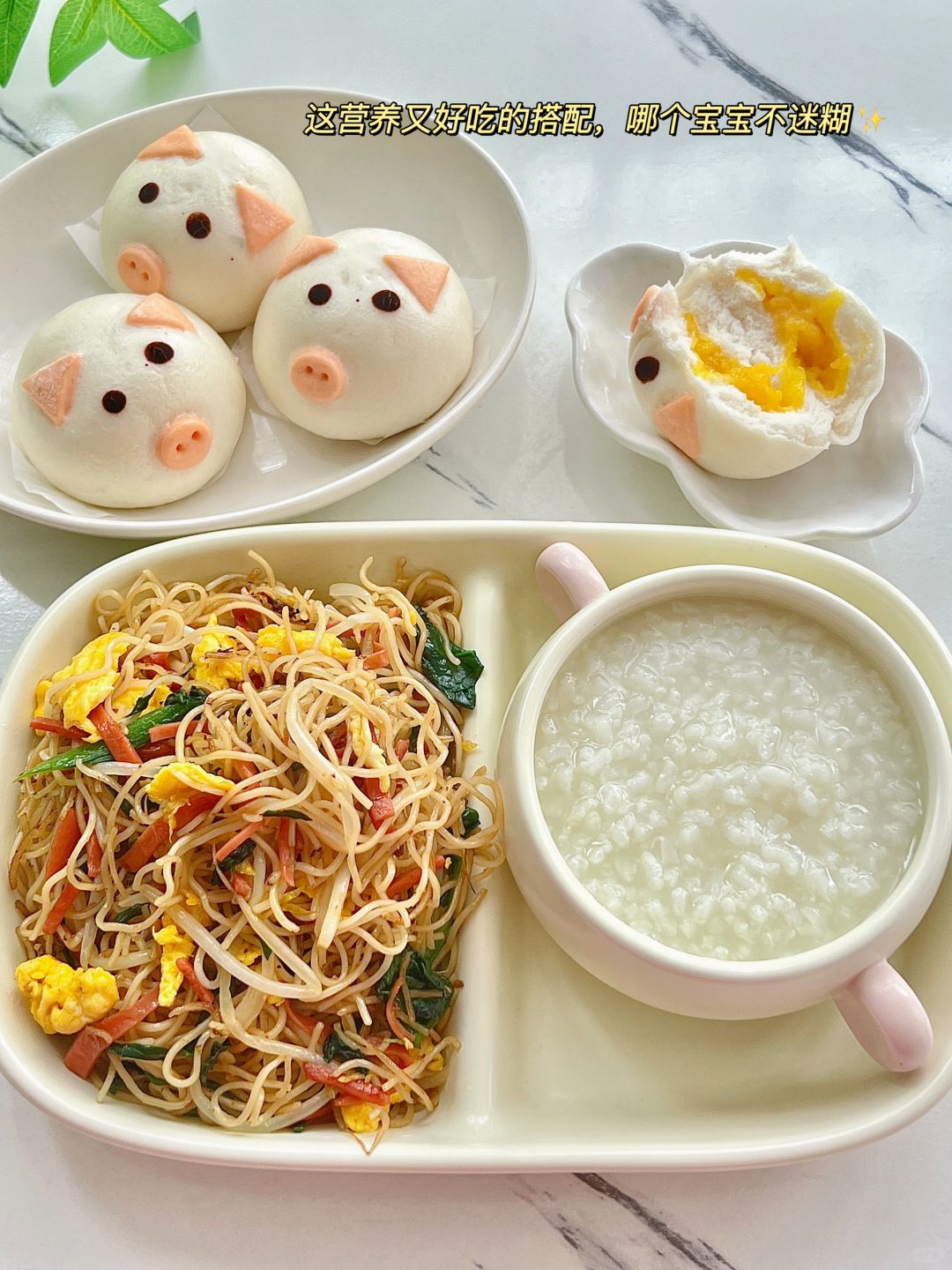 🧚🏻♀️今天给大家分享我家宝宝非常喜欢的一个搭配:宝宝版鸡蛋炒面➕奶黄猪猪包➕经典米粥,我家宝宝真的非常喜欢吃,每次都干光盘,宝妈们也赶紧学起来吧,做法简单,营养好吃哦~