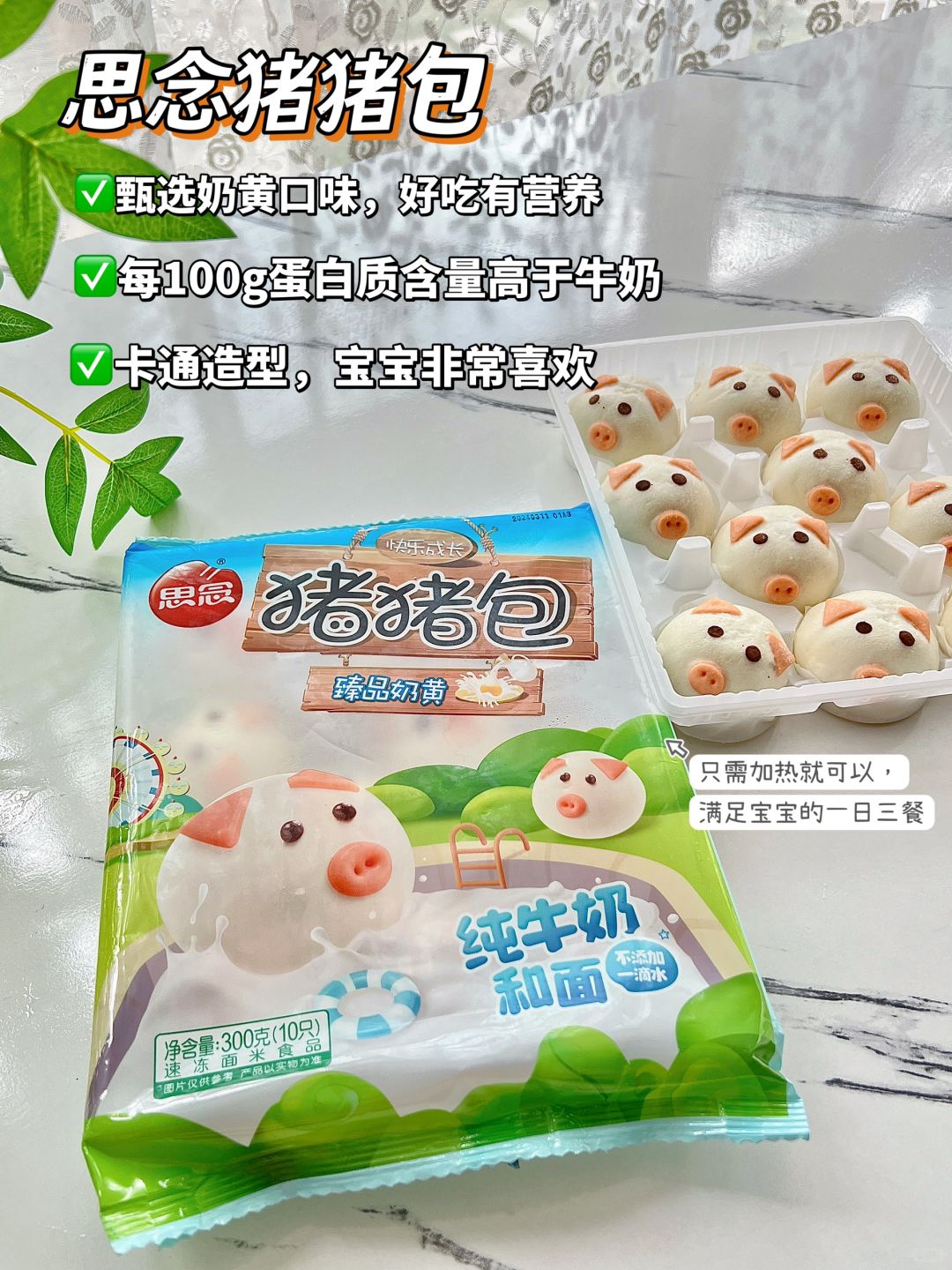 🧚🏻♀️我家给宝宝做早餐,午餐,晚餐,常见的搭配就是思念猪猪包了,加热下就可以吃,可爱的猪猪造型,宝宝非常喜欢,中间的夹心是甄选奶黄,入口绵软,宝宝两口一个[微笑],而且它用的是牛奶和面,奶香奶香的,真的是吃一口就会爱上,赶紧给宝宝安排吧,真的是营养快手餐必备单品哦~