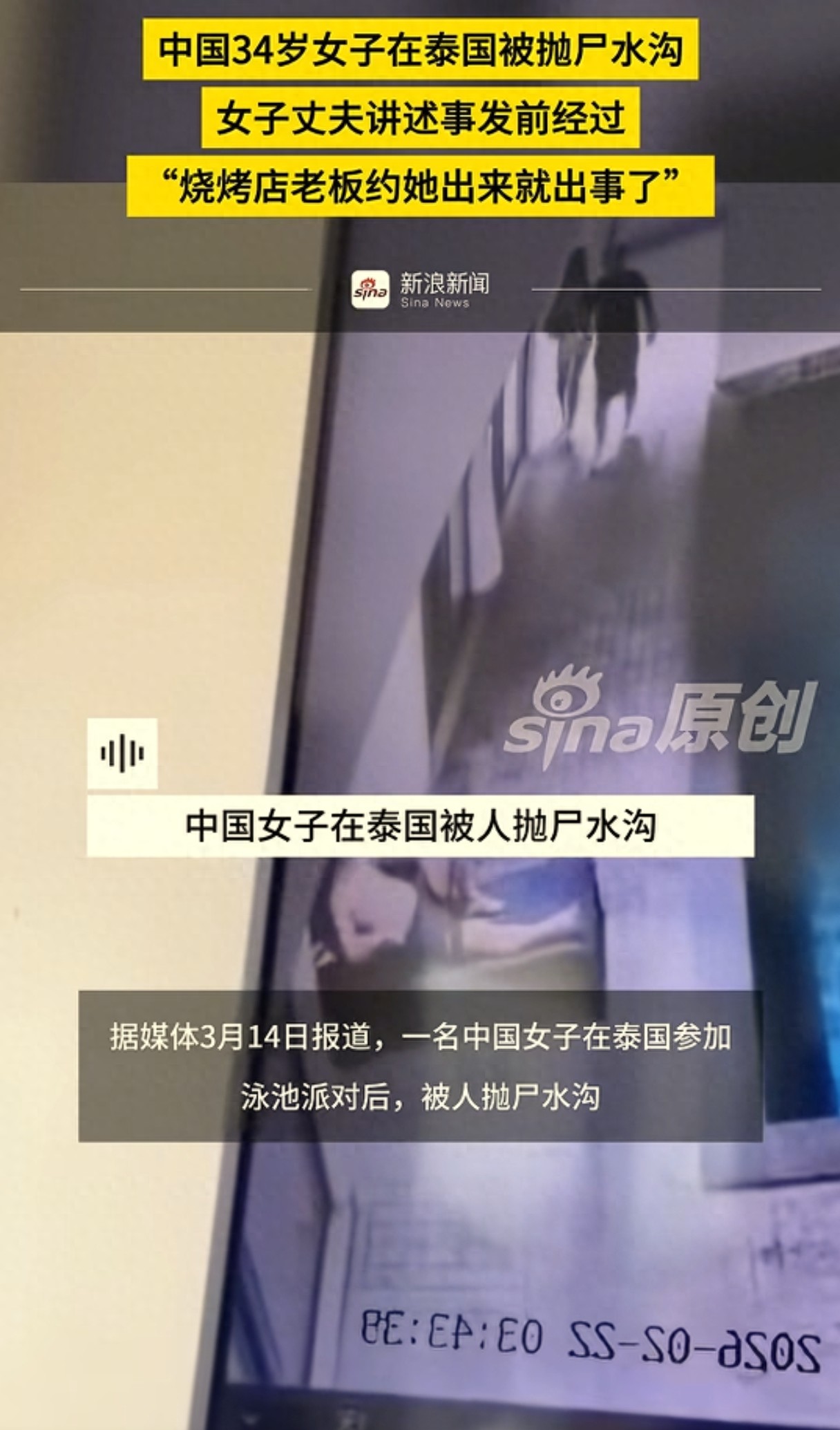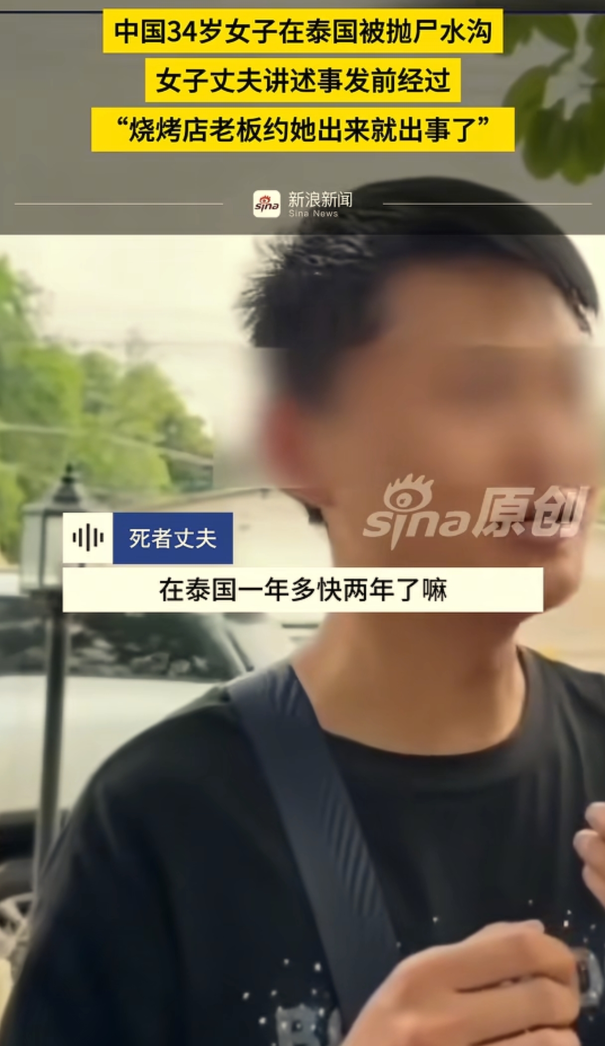 近日,中国一34岁安徽籍女子在泰国被抛尸水沟,女子的丈夫张先生讲述了事发前的经过。说烧烤店老板约他妻子出来,就出事儿了。他希望能查明真相,给他妻子一个公道,给家属一个交代。关于烧烤店老板约他妻子的事,是张先生事后在妻子手机里看到的。
