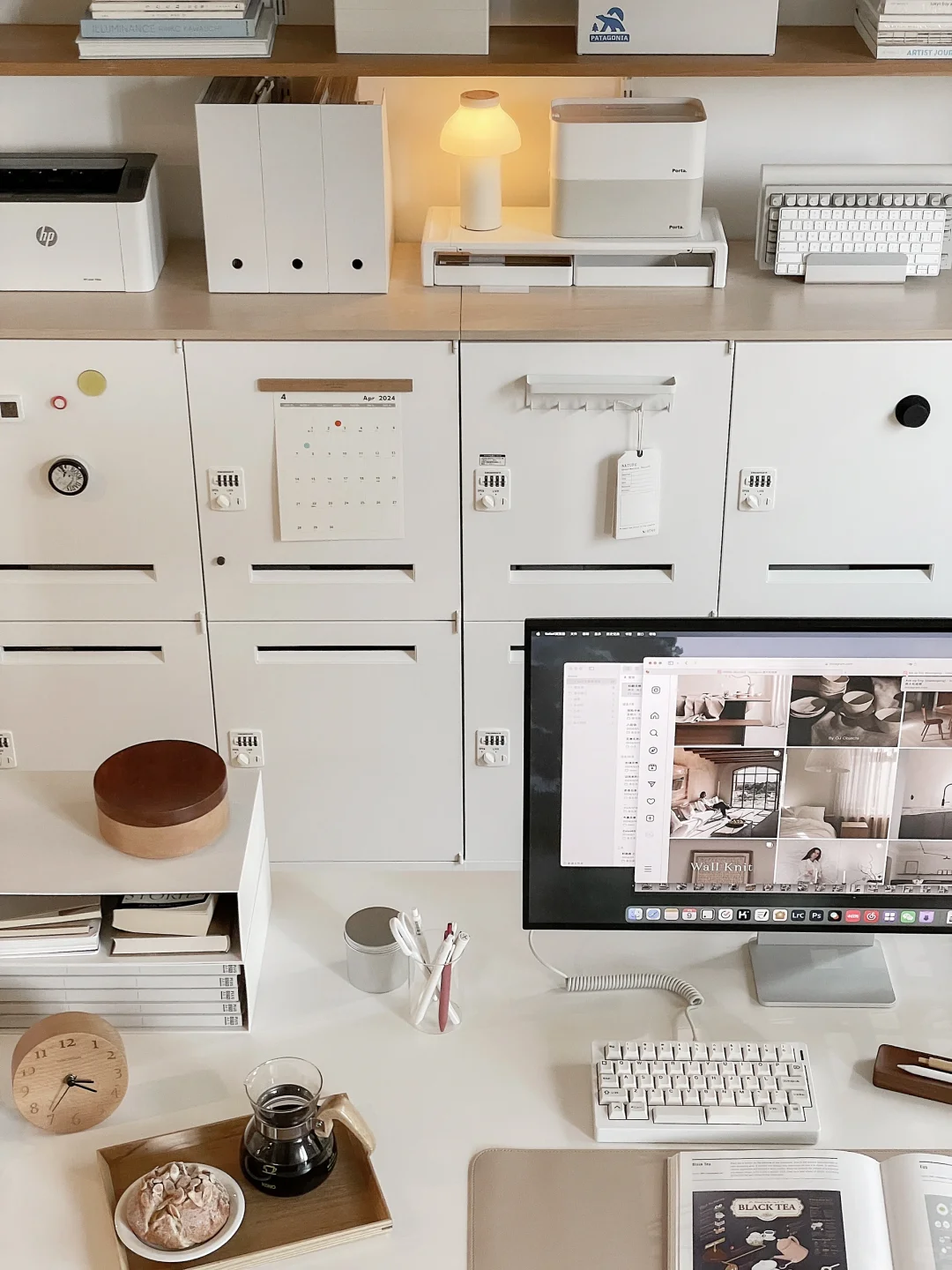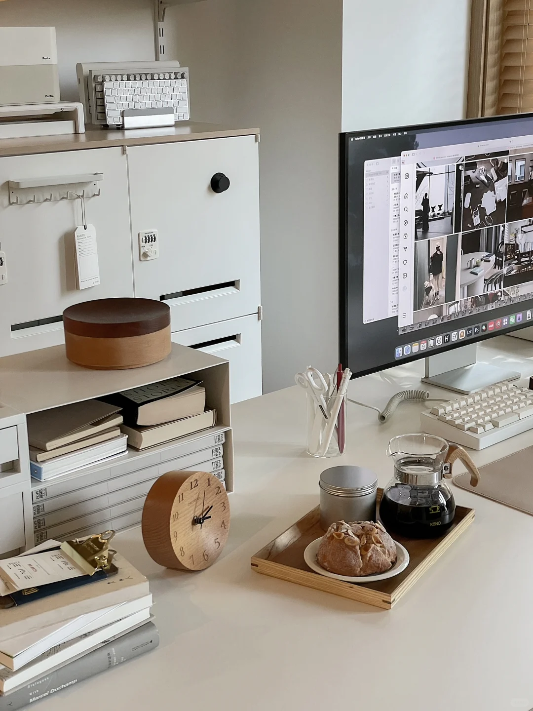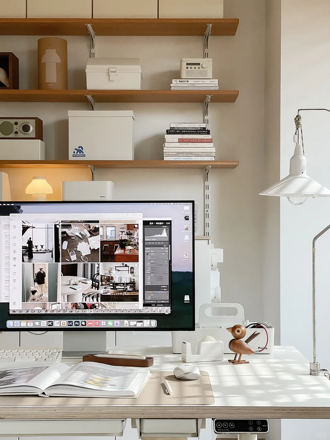 是半个书房的日常场景, 好多人问的书桌桌面是海洋板, 板子上面不是桌布是白色饰面, 海洋板+升降桌腿自己搭的, 2.2米很重很重~ 后面铁皮柜是钢制的, 很难买到了这款原版。