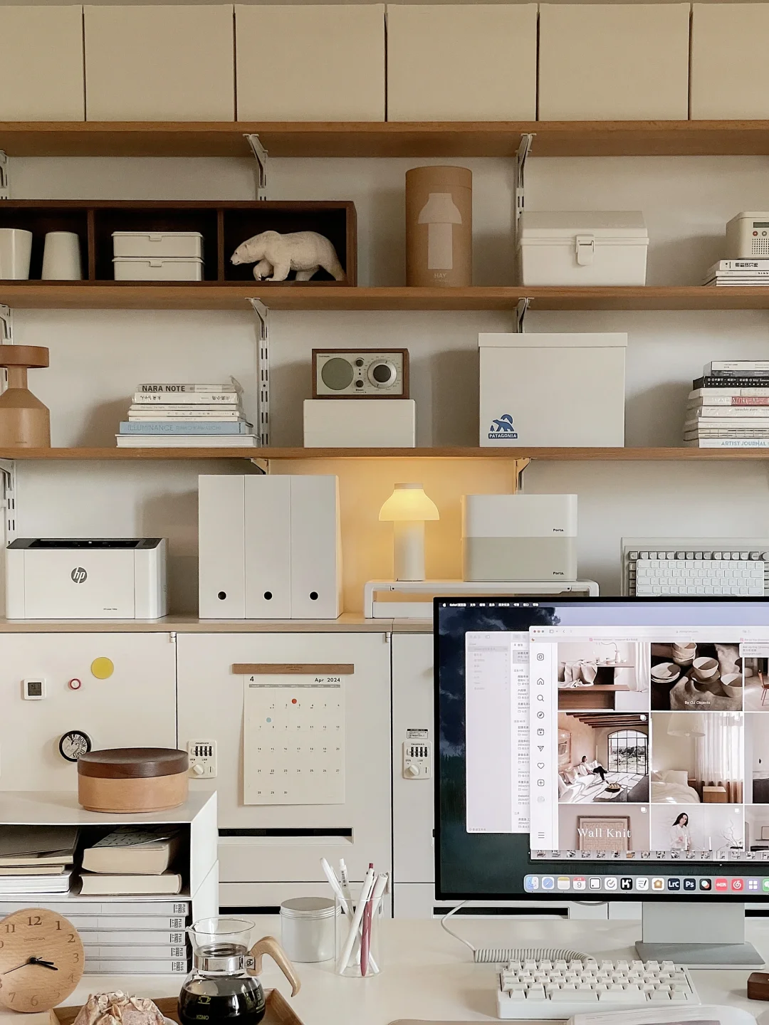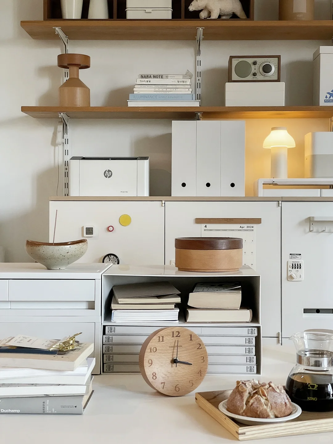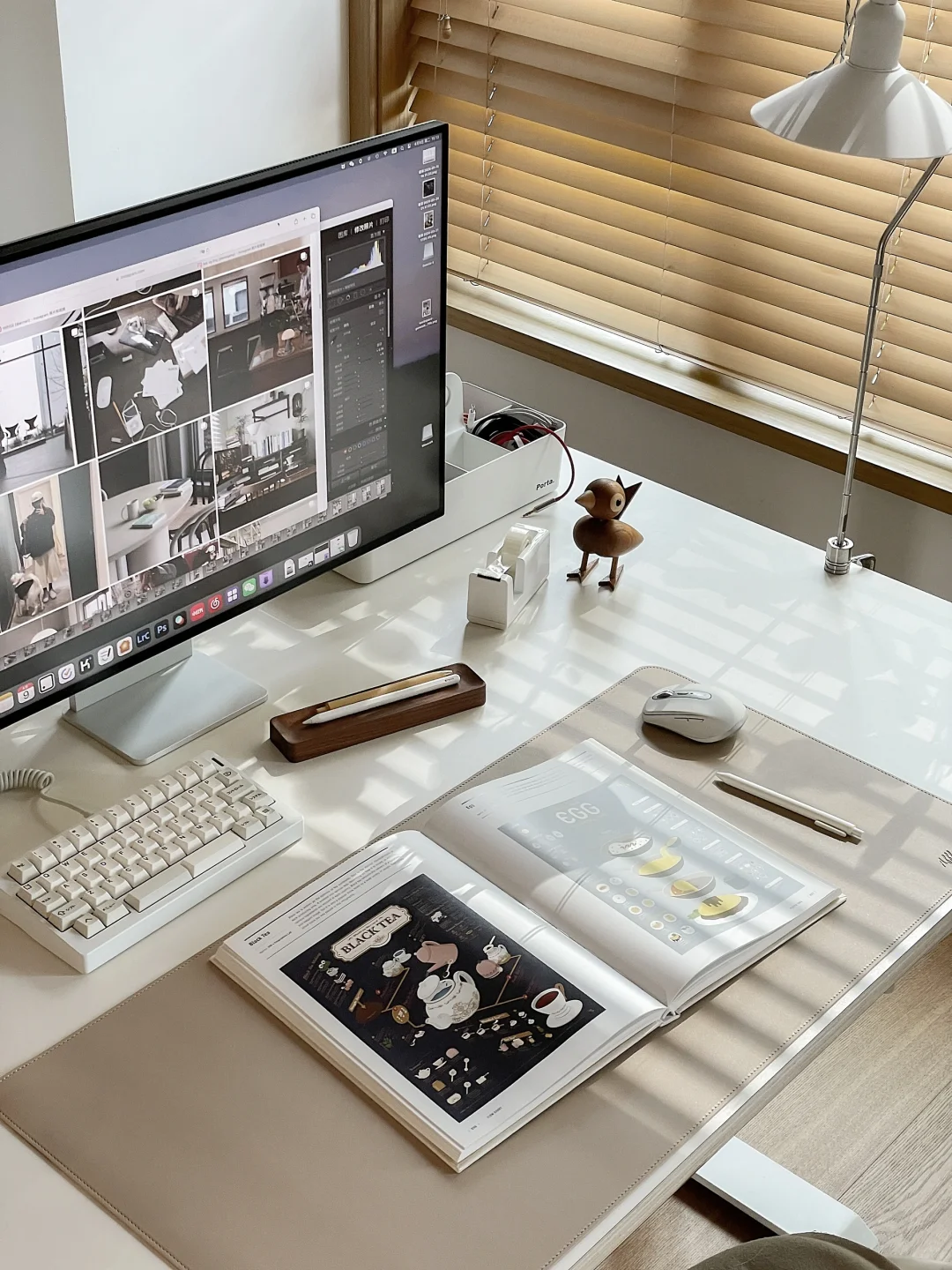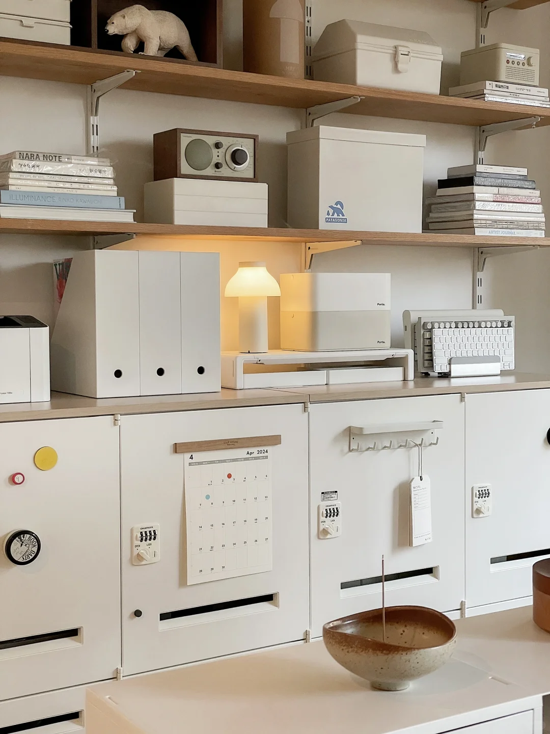 是半个书房的日常场景, 好多人问的书桌桌面是海洋板, 板子上面不是桌布是白色饰面, 海洋板+升降桌腿自己搭的, 2.2米很重很重~ 后面铁皮柜是钢制的, 很难买到了这款原版。
