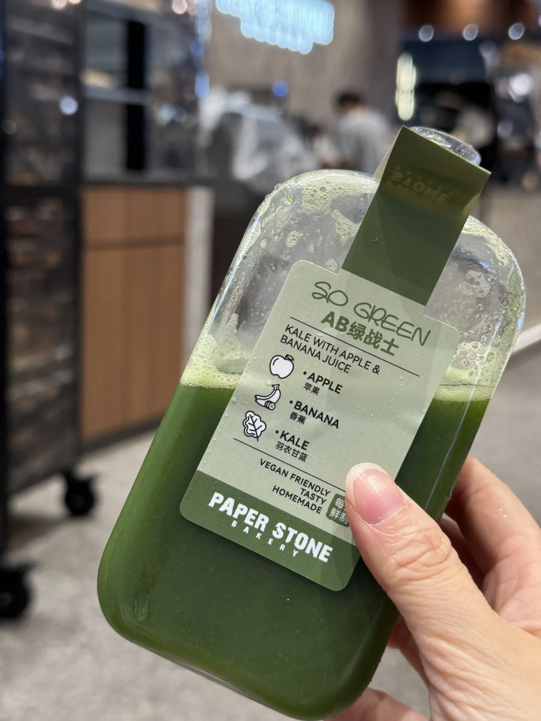 纸石头真的在走健康路线,看到这个饮品的配方实在走不动道,这不是天选排便神器吗,苹果➕香蕉➕羽衣甘蓝。