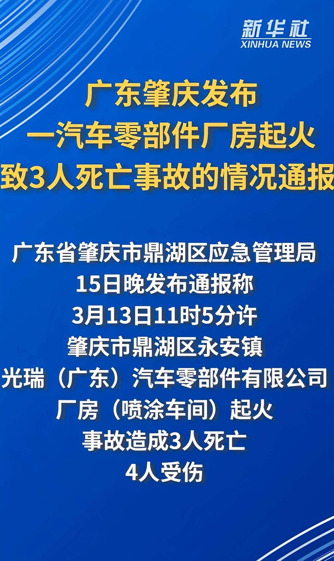 3月15日上午,山东烟台莱州众安汽车零部件有限公司发生一起机械伤害事故,事故造成3人死亡,目前事故原因正在进一步调查中。
