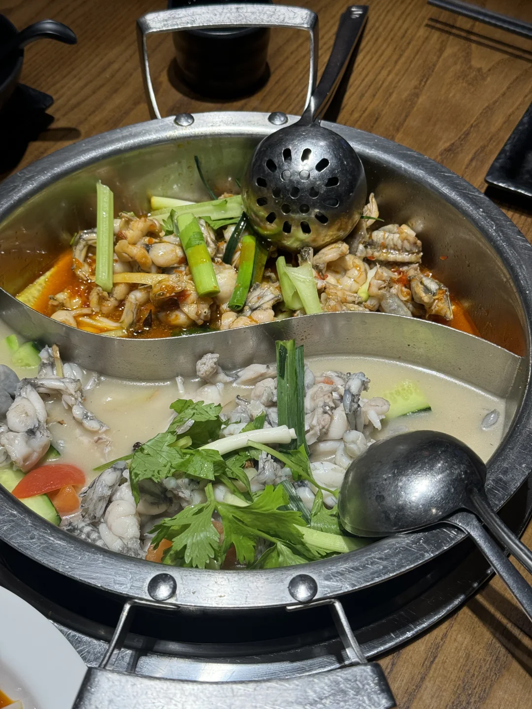 性价比较低的一餐,但是锅底还不错,清汤锅感觉应该是鱼汤打底的很浓郁,蛙一般般,不算肥美,有点像贵州的汤锅,蛙还是做干锅的好吃些,反正就是没有想象中那么的好吃。我们停在路边的车位车费刺客,半小时五块钱。后面才知道可以把车停到动漫城,消费后可以【免费】停车3小时。