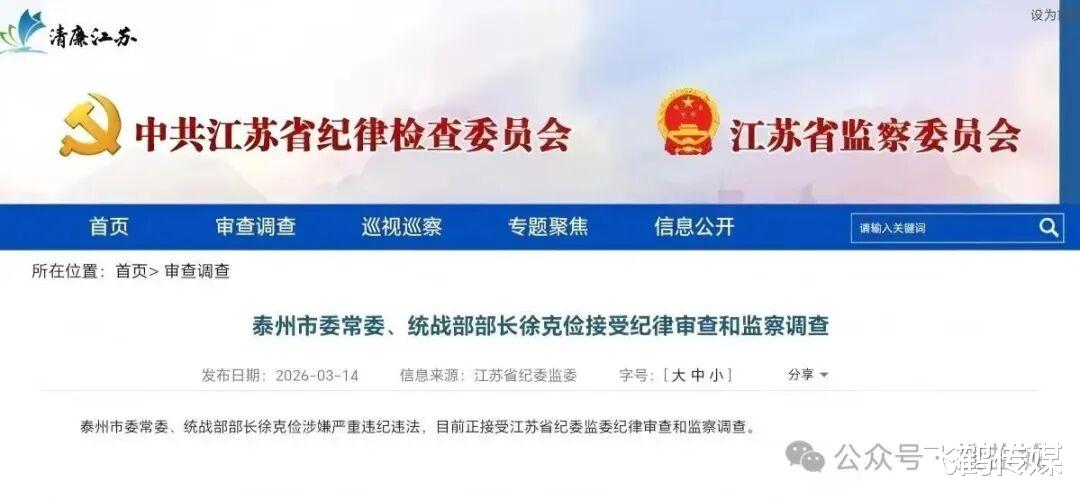 2026年3月14日,江苏省纪委监委官网发布一则重磅消息,瞬间引发社会广泛关注:泰州市委常委、统战部部长徐克俭涉嫌严重违纪违法,目前正接受纪律审查和监察调查。这一消息不仅标志着又一名地方高级官员倒在反腐利剑之下,也再次彰显了全面从严治党向纵深推进的坚定决心。