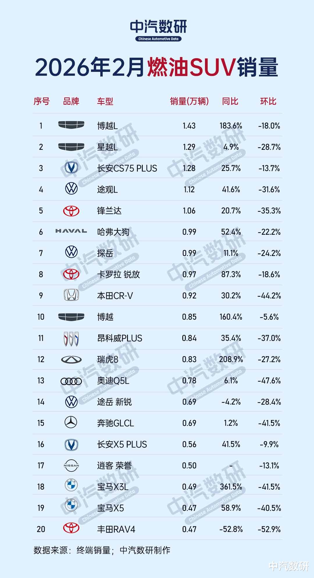 2月燃油SUV销量榜中,博越L以1.43万辆登顶,星越L、长安CS75PLUS分别夺得亚军和季军,前三名均为自主品牌,自主车型成为燃油SUV市场的主力军。另外,瑞虎8同比暴涨208.9%,博越同比增长160.4%,哈弗大狗、卡罗拉锐放等车型同比涨幅超50%。