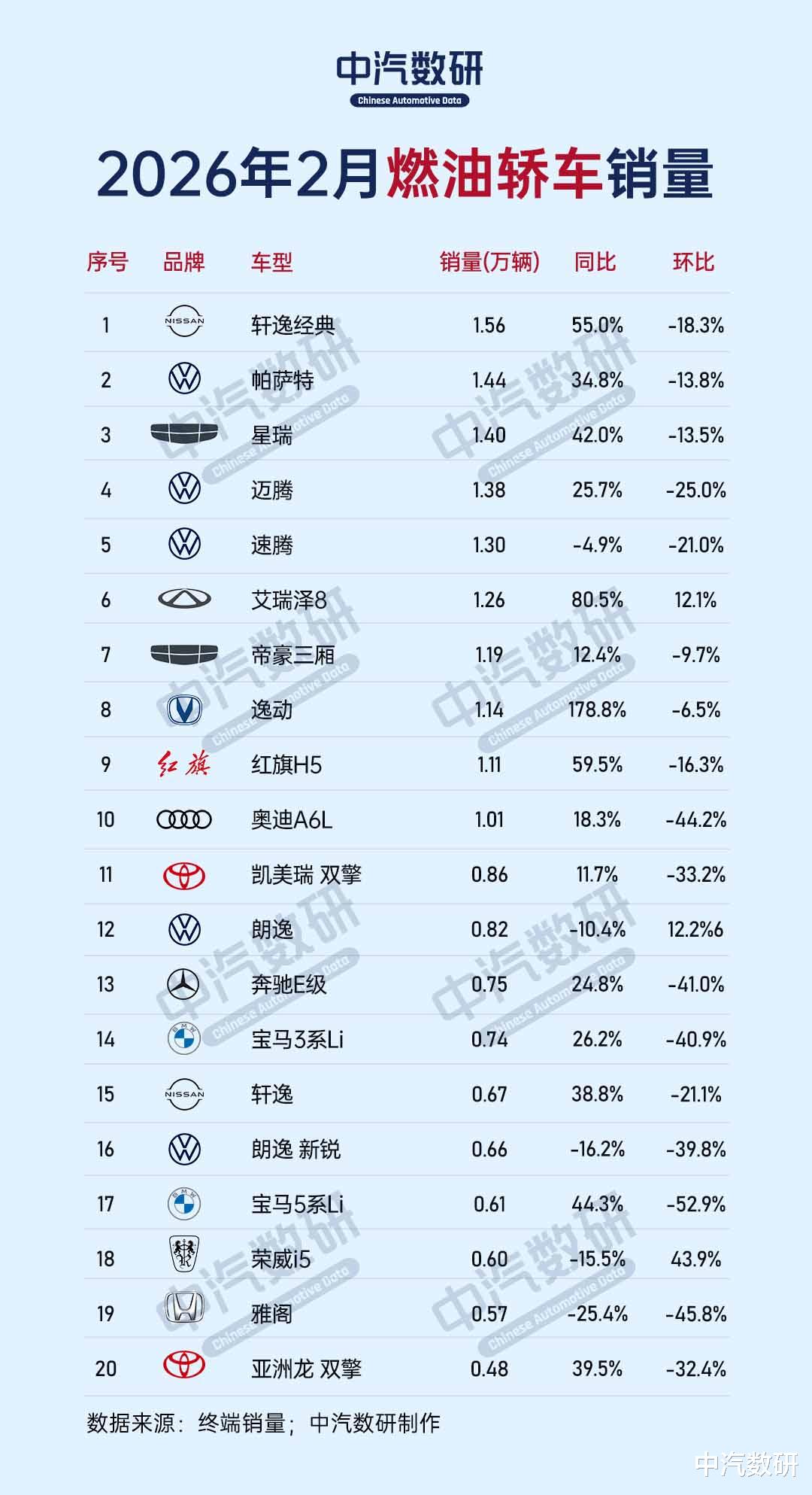 2月燃油轿车销量榜中,轩逸经典以1.56万辆的成绩登顶,帕萨特、星瑞、迈腾紧随其后,形成自主与合资头部对峙的格局。