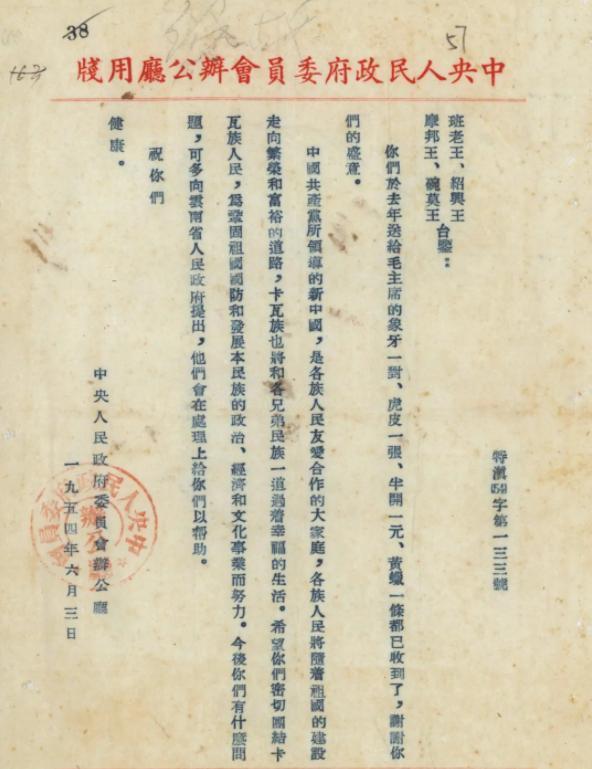 由于交通条件的限制,该信件延迟至次年才送达毛主席处。在审阅了这封饱含深情的信件后,他专门指示中央人民政府委员会办公厅给班老地区的首领回信。信中不仅对佤族首领表达了慰藉,还明确指出,未来若遇任何难题,可直接向云南省人民政府求助。