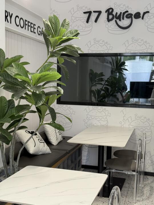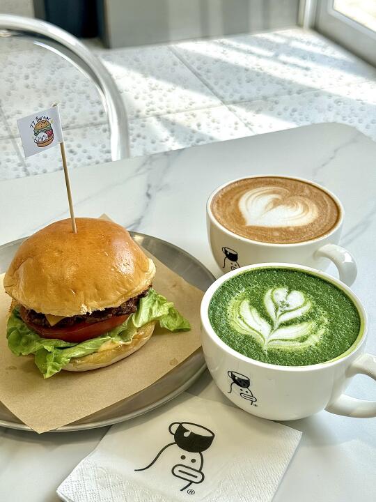 里面环境平平无奇 外面白色基调还可以 有帐篷椅 天气好随便拍拍还是可以的 🍔香的 里面料很足 抹茶拿铁不小心放了糖 小姐姐很好 又重新做了一杯