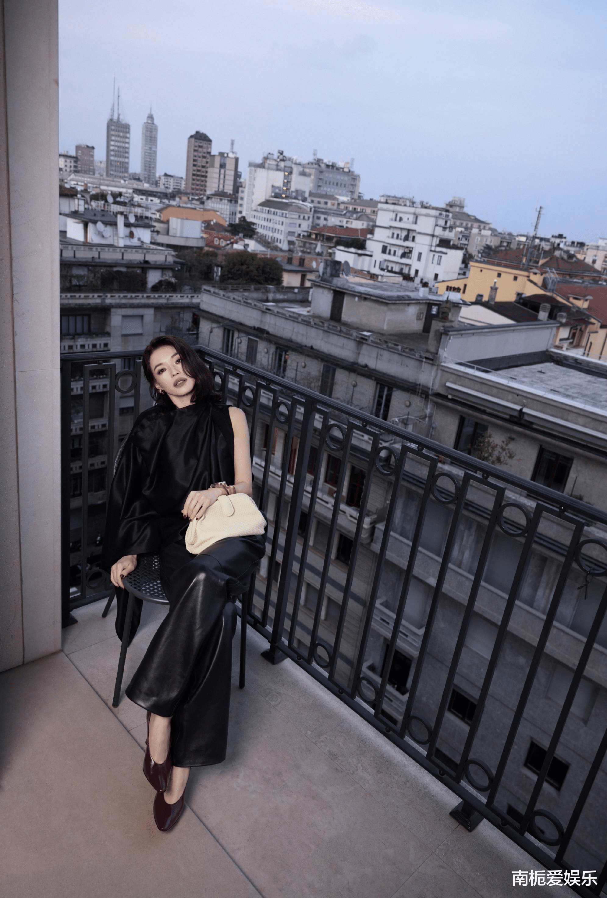 舒淇身着品牌专属定制的全黑造型,上身是哑光丝缎质地的露肩上衣,温润的光泽感恰到好处地凸显了锁骨的线条美;下身搭配同色系做旧哑光皮质长裤,冷硬的材质与上衣的柔滑形成了巧妙的“材质对冲”。为了驾驭这套侧面带有镂空设计的造型,她甚至笑言特地早起运动。整套Look仅以一只琥珀色编织手包和酒红色尖头高跟鞋点缀,便轻松打破了暗色的沉闷。