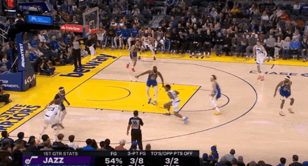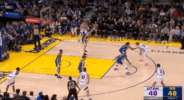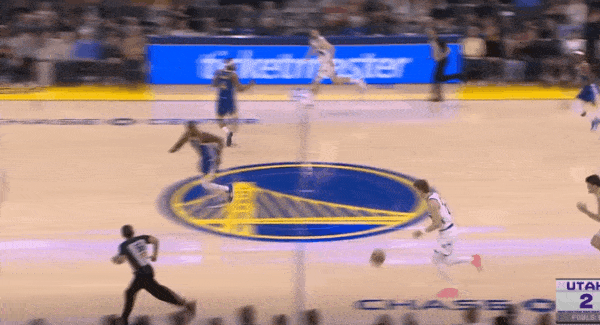 接队友上球后持球推动反击直杀篮下,面对格林推球变向后立即合球起跳,顶着格林上篮打进。