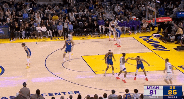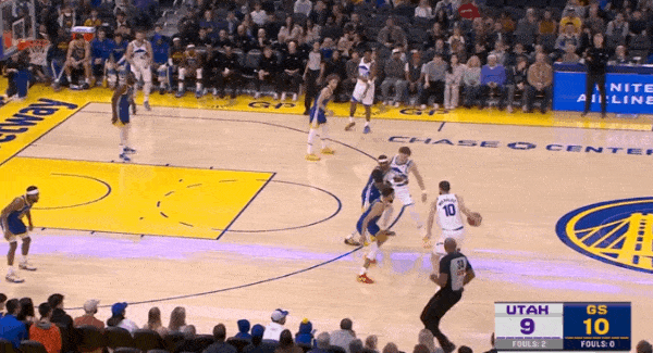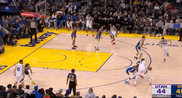 借米哈下掩护卷切篮下接球,炸球调整后佯装起身终结点飞佩顿,随后顶着穆迪犯规上篮打进,完成篮下一打二的同时还打成2+1。