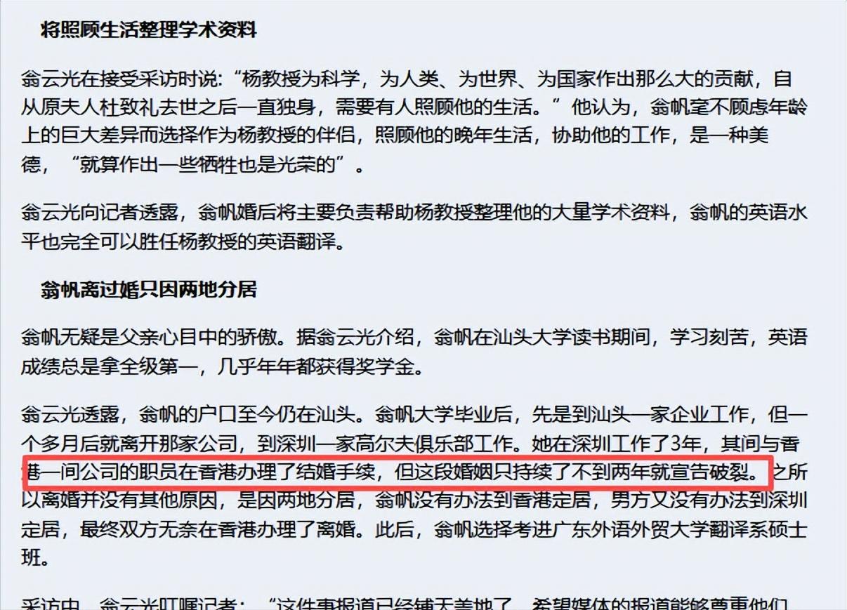 这个谣言没有任何实际依据,全是编造出来的八卦,甚至有人凭空捏造了“出轨对象”,说翁帆和某个年轻男子关系暧昧,趁着杨振宁年事已高、身体不好,偷偷来往。