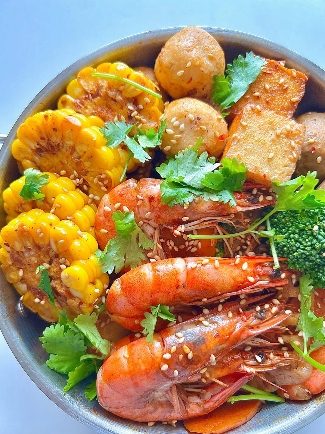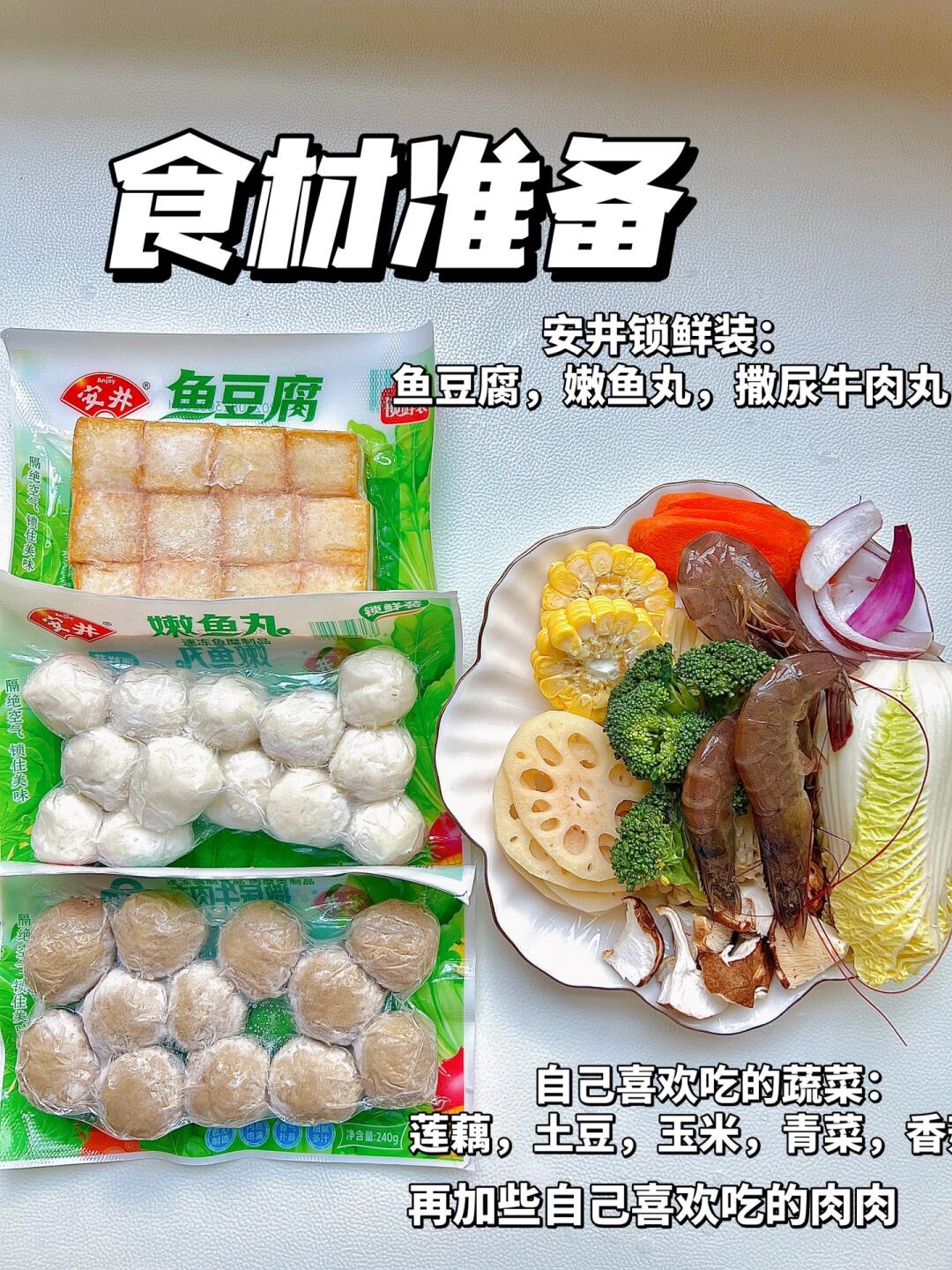 火锅底料、安井锁鲜丸子、香菇、西兰花、莲藕,土豆、大虾等