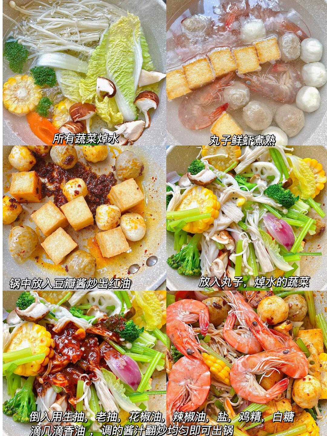 ①首先把各类食材洗净装盘,将素菜分别焯水,丸子焯水备用,爆香蒜末和一勺豆瓣酱,下火锅底料炒至融化,翻炒均匀,下所有菜翻炒均匀