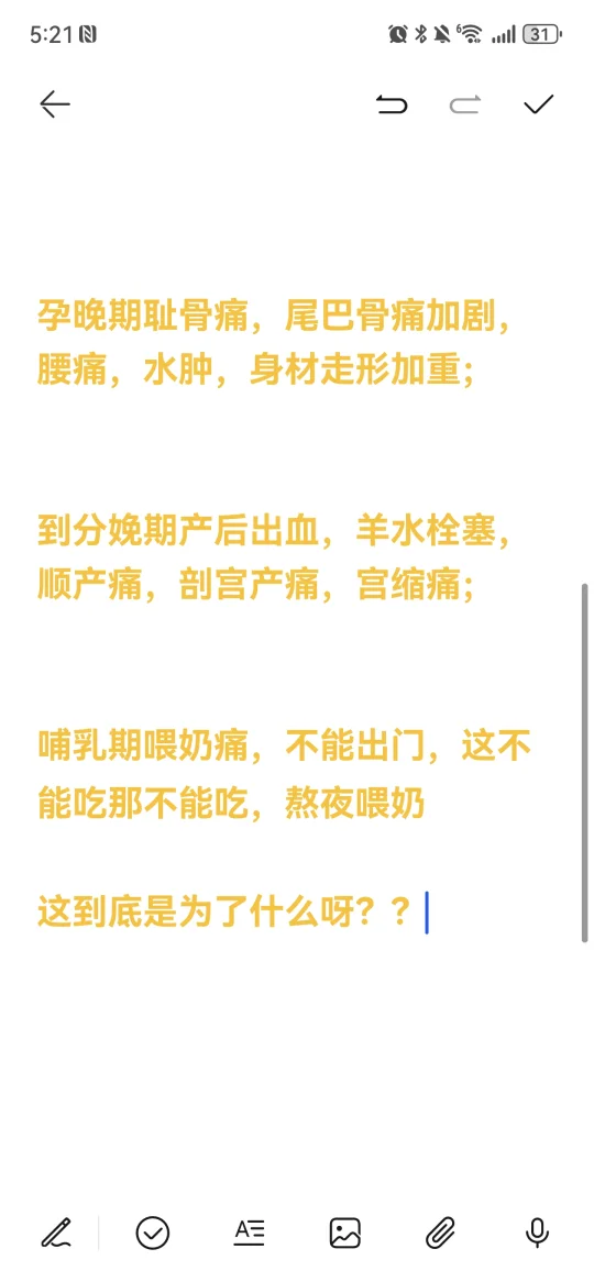 孕20周长纹,一个人思考着,生育的意义,为什么要承受孕早期孕吐,反胃,恶心,反酸烧心,胀气,便胸痛,头晕; 孕中期尾巴骨痛,抽筋,便秘,长胖,身材走形,长妊娠纹,走路笨重,牙龈出血; 孕晚期耻骨痛,尾巴骨痛加剧,腰痛,水肿,身材走形加重; 到分娩期产后出血,羊水栓塞,顺产痛,剖宫产痛,宫缩痛; 哺乳期喂奶痛,不能出门,这不能吃那不能吃,熬夜喂奶[哭惹R][哭惹R] 这到底是为了什么呀[叹气R][叹气R]