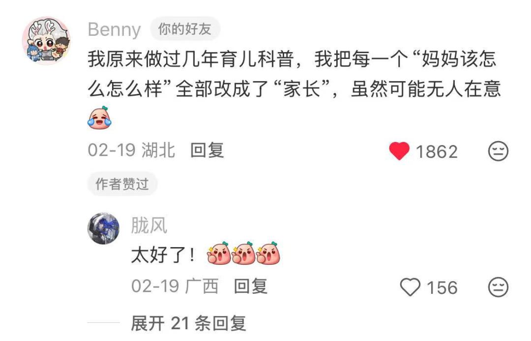 把“妈妈”改成“家长”评论区点赞最多的一条留言来自 Benny。
