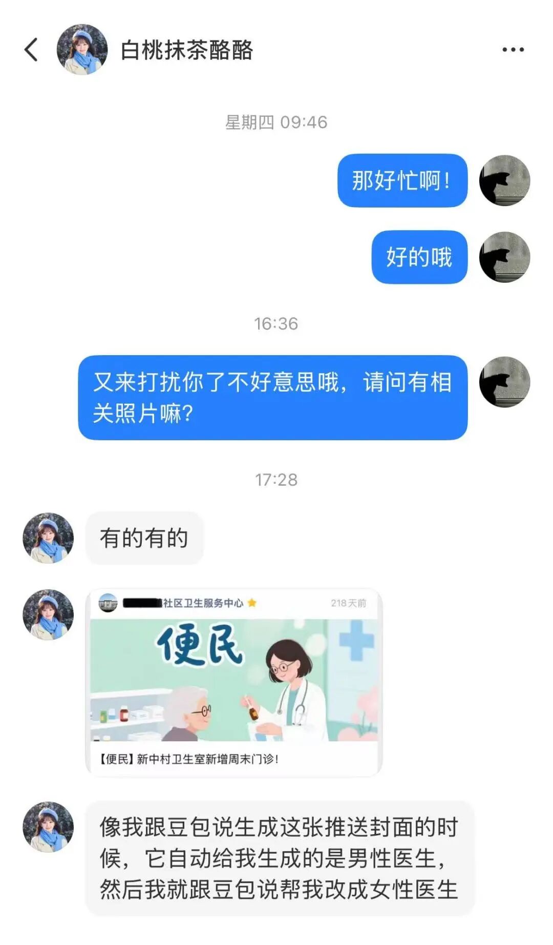 白桃在社区卫生服务中心工作,她发现一篇没有明确标注性别的医疗推文发出来,多数人脑海里浮现的默认是男性医生。