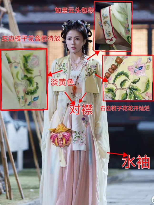 ✅白烁的衣服是对襟样式,虽无领但把女帔领子的样子融入在了包带上,如意云头也表现了出来。