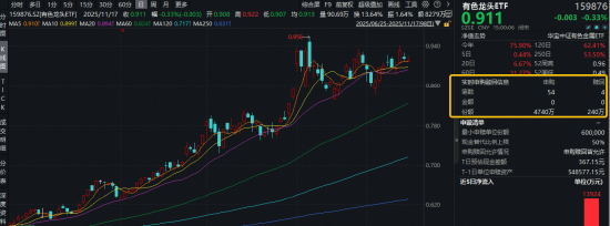 热门ETF方面,受益于能源金属方向领涨拉升,揽尽有色金属行业龙头的有色龙头ETF(159876)盘中几度翻红,场内价格摸高0.66%,最终难敌大盘颓势,最终微跌0.33%。