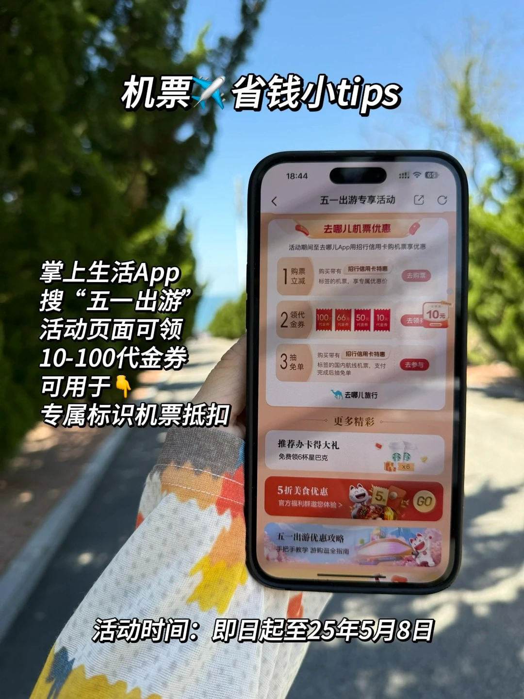 🌟纠结机票价格的小伙伴,可以用招行信用卡在去哪儿App买机票!掌上生活App搜“五一出游”,下滑就能限时抢10-100元不等的机票代金券啦~然后在去哪儿买标有【招行信用卡特惠】的机票就可以用,更多玩法你们可以去掌上生活App看❗
