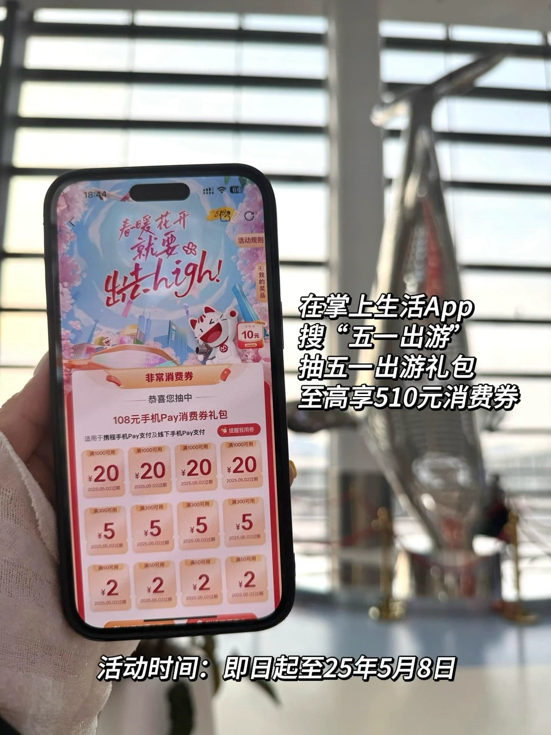 🌟结账跟我一样用招行信用卡,能免费抽消费券包!掌上生活App搜“五一出游”就能看到!我抽到了1⃣0⃣8⃣元的手机pay消费券包(最高有人抽到了510元哦!买单通过手机NFC功能支付能用,轻松省下两个炸糕钱