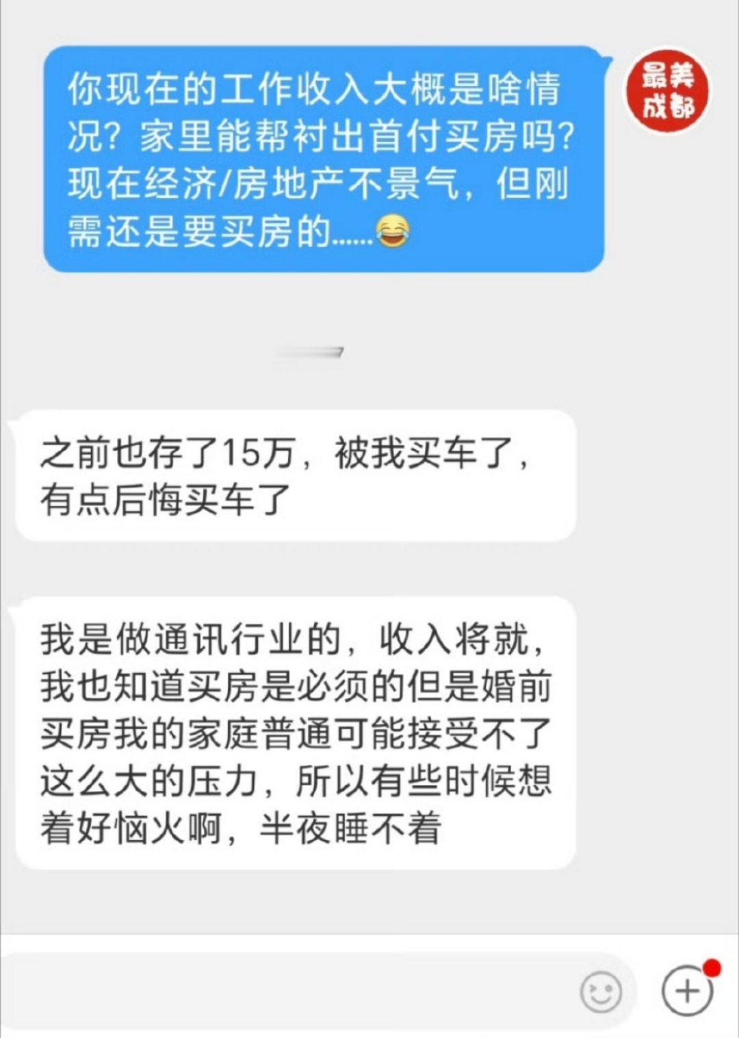 【每次谈到结婚时女方总是要求先买房!我现在很焦虑忧郁崩溃】小美,我95年男生通讯行业,收入还将就,家庭条件一般。之前攒了15万但我拿来买车了,现在有点后悔。现在天天面对催婚,生活工作也一塌糊涂!每次认识的女生,都是卡在让我婚前在成都买房,我真的快焦虑死了!我们90后真的压力好大,晚上睡不着… 老爸帮儿子征婚招来杀猪盘你会要求买房吗?你现在生活压力大么、会焦虑么?第一次对难熬有了实感 成都