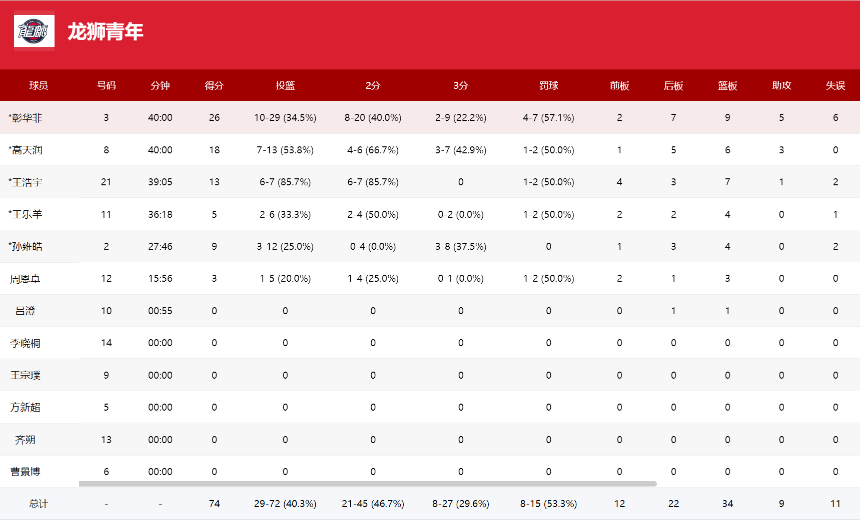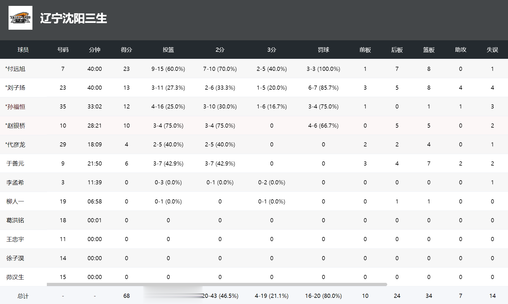 辽宁:付远旭23分、刘子扬13分、孙福恒12分。