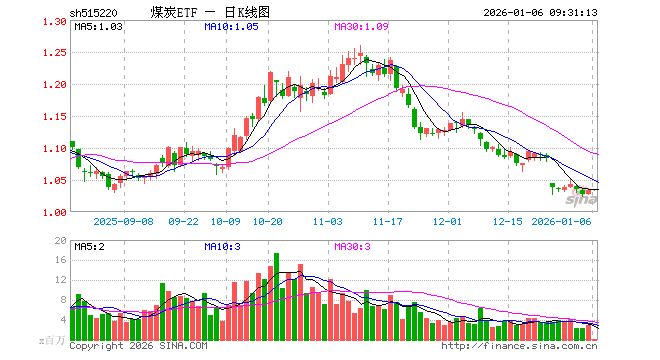 1月6日,煤炭ETF(515220)开盘跌0.10%,报1.033元。煤炭ETF(515220)重仓股方面,陕西煤业开盘涨0.42%,中国神华涨0.10%,兖矿能源涨0.00%,中煤能源涨0.00%,山西焦煤跌0.15%,潞安环能涨0.00%,美锦能源涨0.00%,华阳股份涨0.12%,淮北矿业跌0.09%,平煤股份涨0.00%。