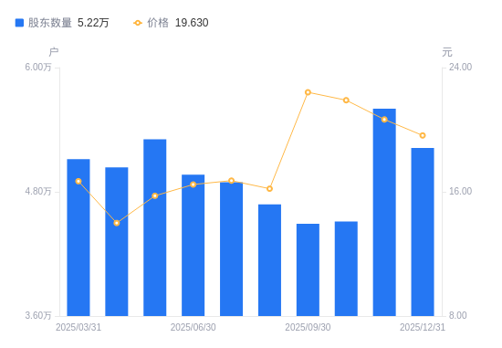 日期A股户数(户)流通A股户均持股数(股)户均持股市值(万元)2025-12-31522457060.2513.862025-11-28560296583.4313.602025-10-10451278173.8817.902025-09-30449058214.2918.412025-07-31467827884.7212.772025-07-18489337538.1212.602025-06-30496607427.7612.232025-06-10530776949.5810.942025-04-18503607324.5210.252025-03-31511577210.4112.03