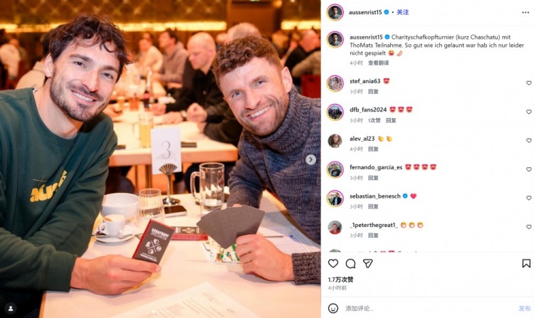 直播吧1月10日讯已经退役的德国足坛名宿胡梅尔斯在今日通过社媒晒出和老友托马斯·穆勒的合照。