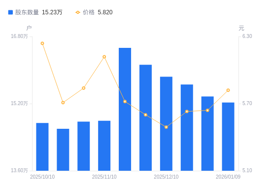 日期A股户数(户)流通A股户均持股数(股)户均持股市值(万元)2026-01-0915226721950.9512.782025-12-3115370021746.2912.262025-12-1915657321347.2612.022025-12-1015841821098.6411.582025-11-2816127620724.7511.612025-11-2016529120221.3411.562025-11-1014791522596.7913.832025-10-3114769422630.6113.212025-10-2014600422892.5613.072025-10-1014737922678.9814.15