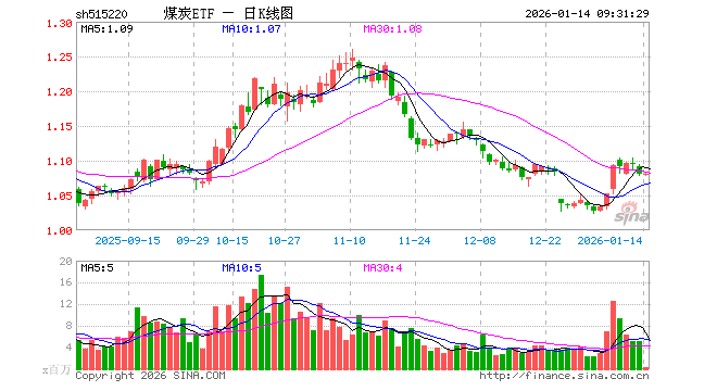 1月14日,煤炭ETF(515220)开盘跌0.09%,报1.080元。煤炭ETF(515220)重仓股方面,陕西煤业开盘涨0.04%,中国神华涨0.24%,兖矿能源涨0.43%,中煤能源涨0.07%,山西焦煤跌0.29%,潞安环能涨0.15%,美锦能源跌0.21%,华阳股份涨0.00%,淮北矿业涨0.00%,平煤股份跌0.23%。