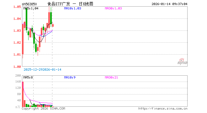 1月14日,食品ETF广发(563850)开盘跌0.19%,报1.033元。食品ETF广发(563850)重仓股方面,海天味业开盘跌0.08%,伊利股份跌0.07%,双汇发展跌0.08%,安琪酵母跌0.50%,中粮糖业涨1.21%,金龙鱼涨0.03%,安井食品跌0.05%,新诺威跌0.32%,汤臣倍健涨0.00%,中炬高新涨0.06%。
