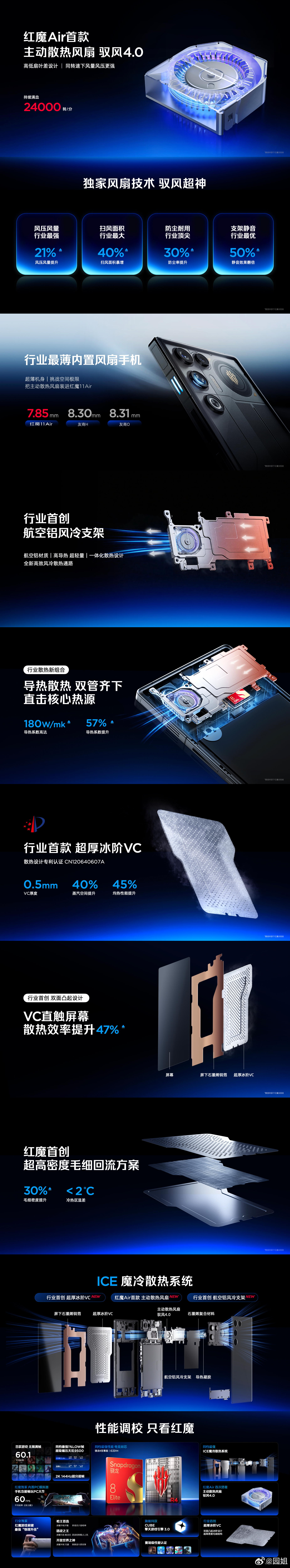 #红魔11air# 搭载行业独家红魔游戏肩键,520Hz行业最快触发,独家内置PC模拟器,搭载的主动散热风扇 驭风4.0,转速24000r/min,行业首款超厚冰阶VC。7000mAh超大电池,120W魔闪快充,全场景 旁路充电,4D震感X轴线性马达,立体声扬声器,高铁电竞模式,红外遥控,全功能NFC,5000万超感光主摄,OIS光学防抖~