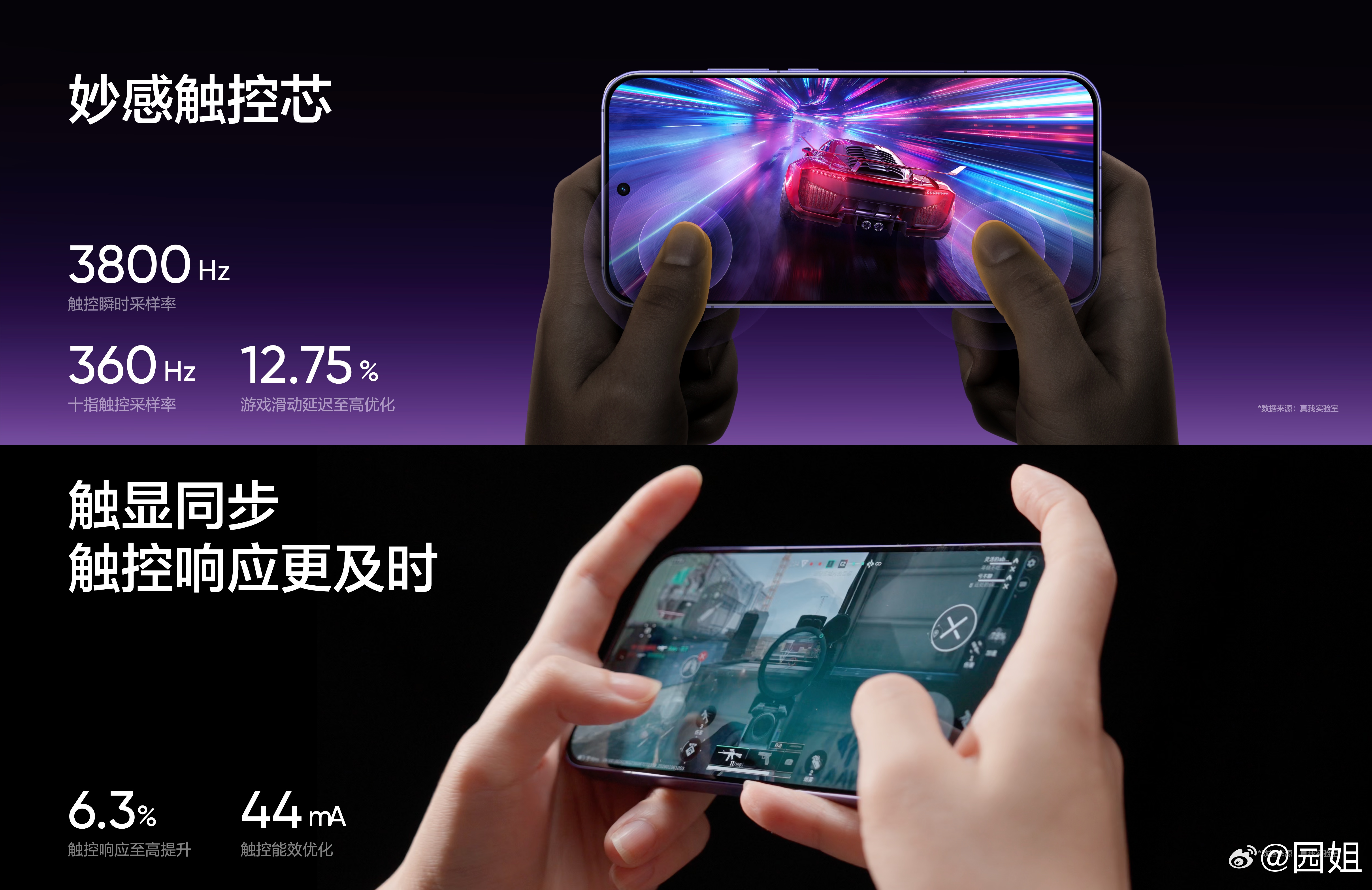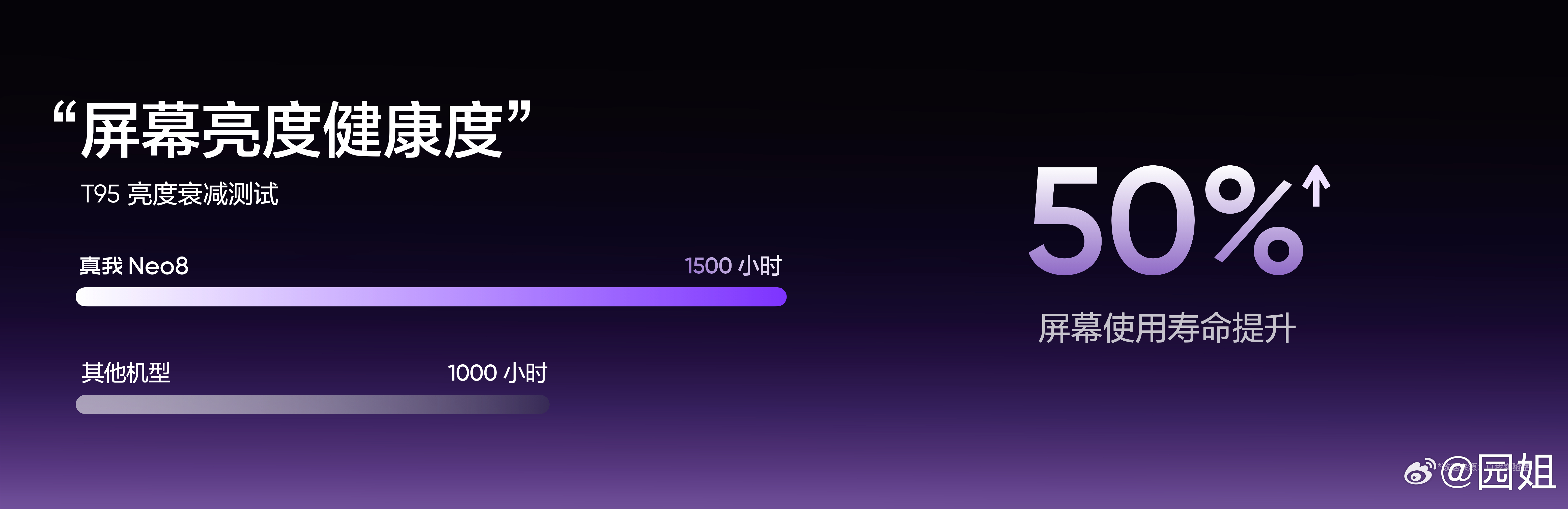 #真我Neo8#全球首发165Hz三星苍穹屏,M14旗舰发光材料加持,同档唯一M14发光材料,发光能效提升26%,手动最高1000nit、全局最高1800nit、局部峰值高达6500nit,更支持3800nit阳光显示,配合激发亮度下的103%P3超广色域,在165Hz满帧模式下,165Hz三星苍穹屏,相比144Hz刷新率功耗降低16%,即流畅又省电-T95是长时间高亮度下测试屏幕亮度衰减到初始值的 95%所需的时间,行业T95标准普遍为1000小时,真我Neo8搭载的165Hz三星苍穹屏将屏幕寿命提升50%,T95达到1500 小时。搭载妙感触控芯,支持3800Hz瞬时采样率、360Hz十指并发触控采样率以及旗舰级触显同步, 支持全亮度DC调光,SVM值低至0.05,通过莱茵TÜV无频闪认证、硬件级低蓝光+AI疲劳检测,挑战最护眼的三星电竞屏。