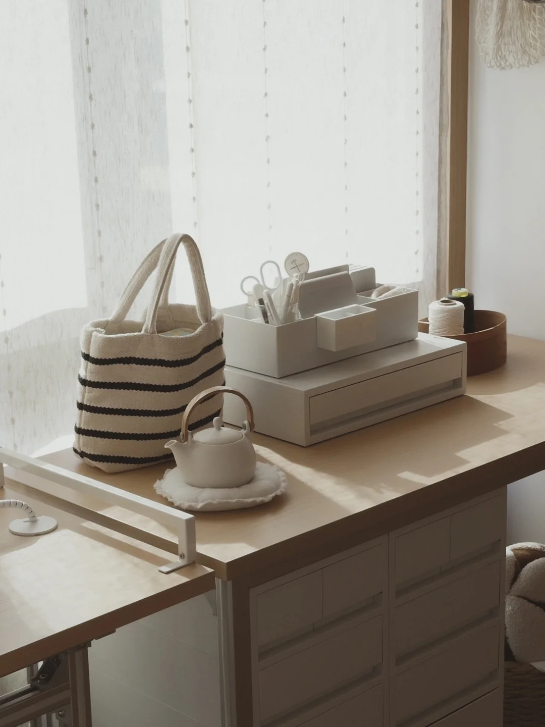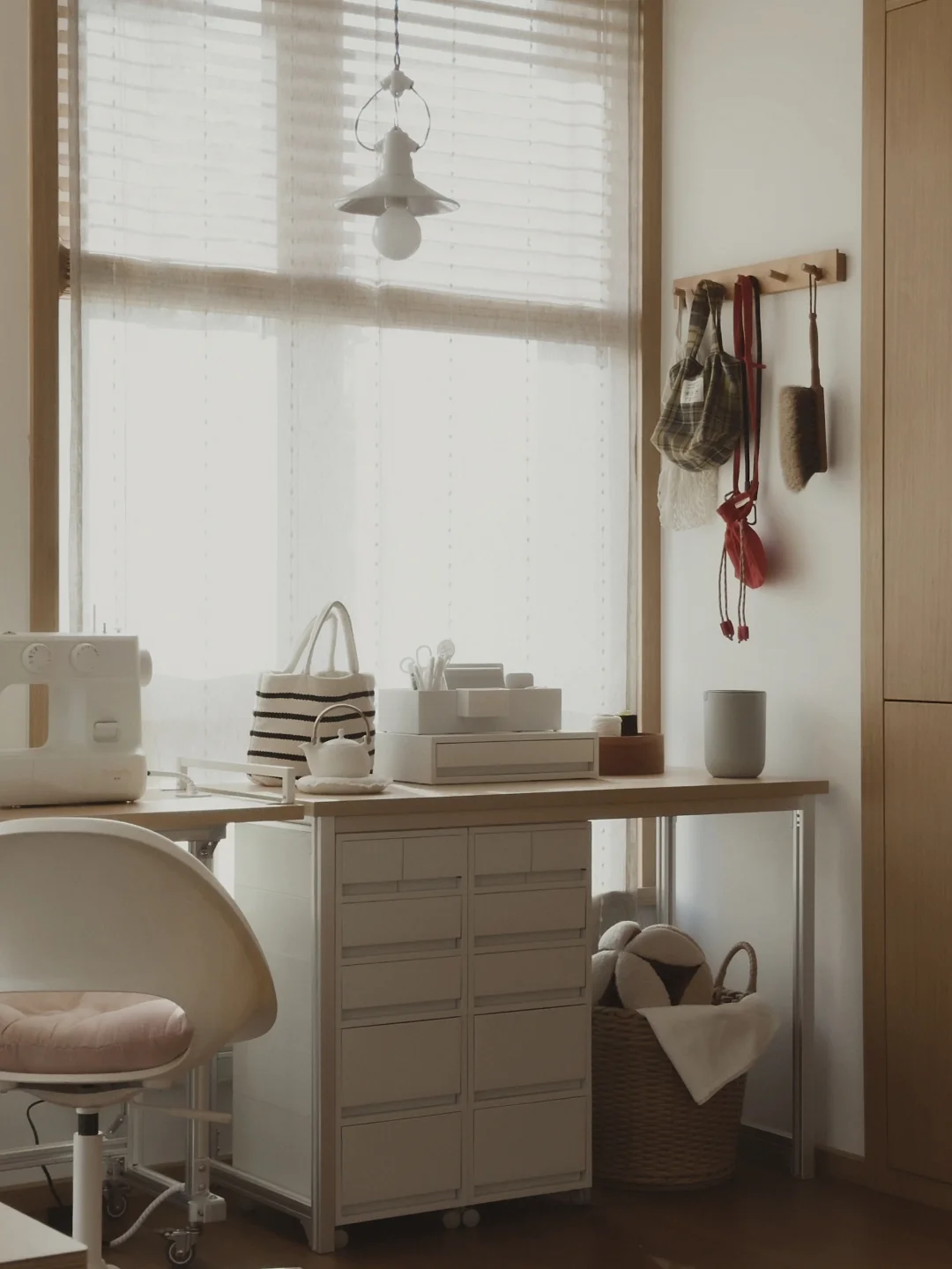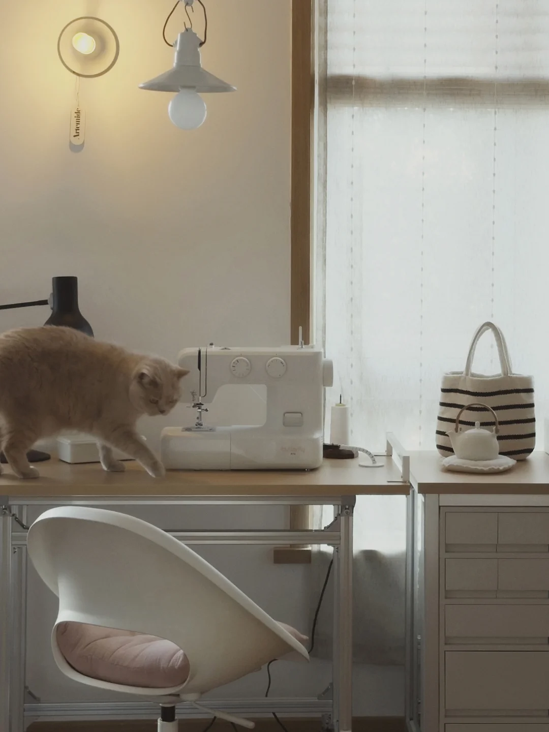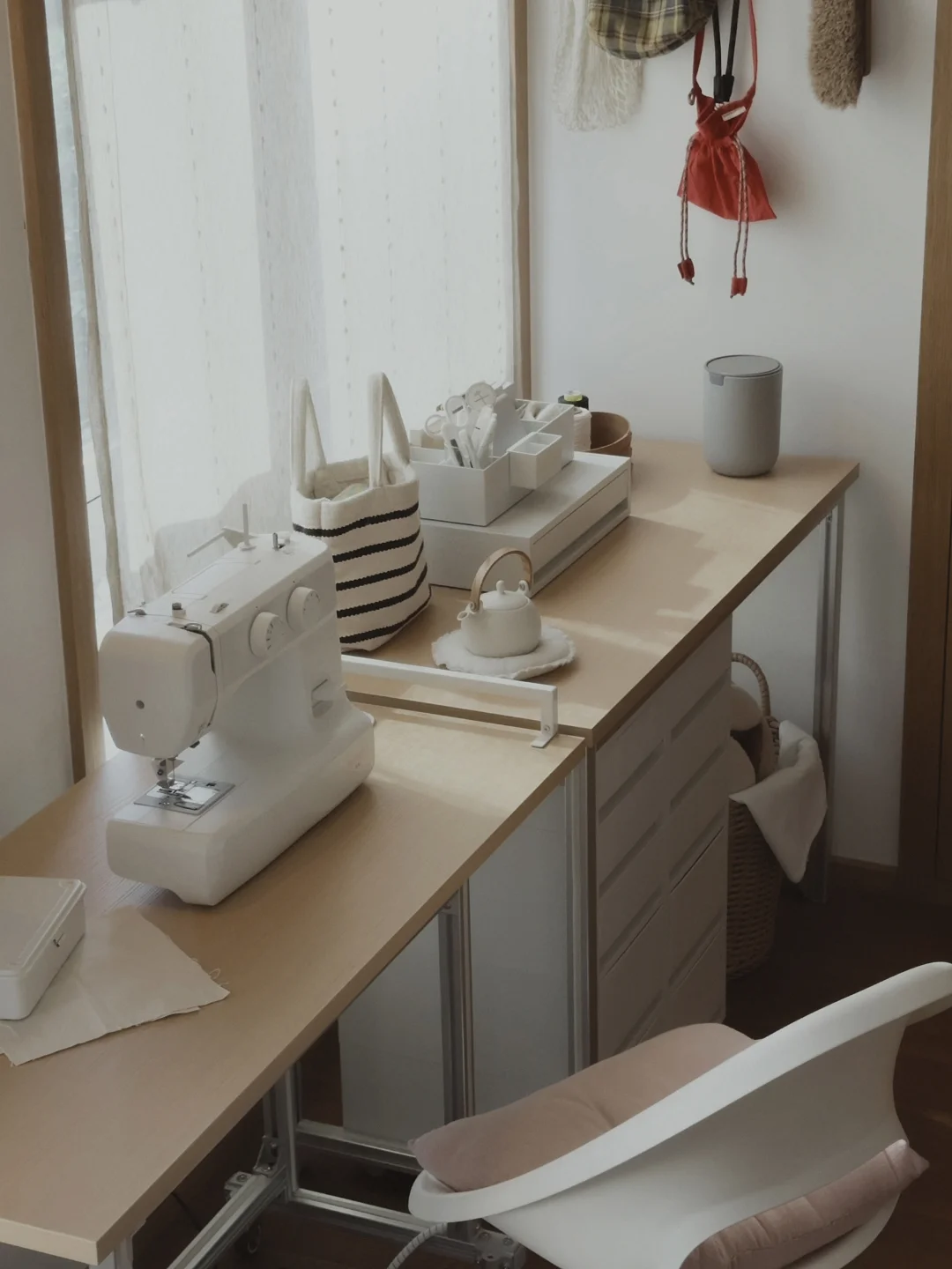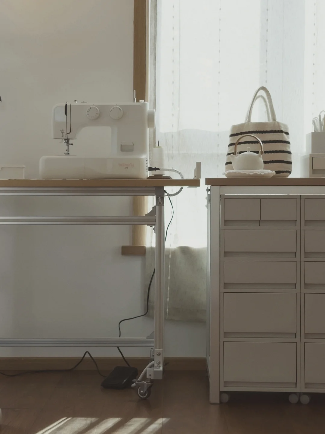 给饼子DIY一个小裁缝区, 满足她的新爱好, 用的型材和板子加上抽屉柜, 简单的搭一只裁缝桌和一个裁缝柜。