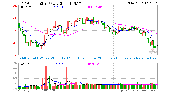1月23日,银行ETF易方达(516310)开盘涨0.23%,报1.281元。银行ETF易方达(516310)重仓股方面,招商银行开盘涨0.00%,兴业银行涨0.10%,工商银行涨0.00%,农业银行跌0.15%,交通银行涨0.15%,浦发银行涨0.00%,江苏银行涨0.10%,平安银行涨0.00%,上海银行涨0.21%,民生银行涨0.27%。