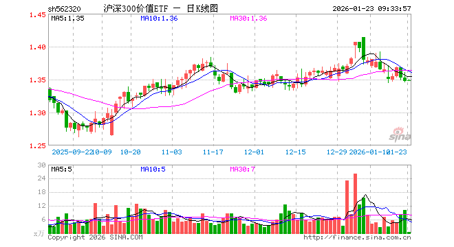 1月23日,沪深300价值ETF(562320)开盘涨0.07%,报1.348元。沪深300价值ETF(562320)重仓股方面,中国平安开盘涨0.62%,招商银行涨0.00%,美的集团涨0.10%,兴业银行涨0.10%,中信证券涨0.29%,工商银行涨0.00%,国泰海通涨0.60%,农业银行跌0.15%,交通银行涨0.15%,格力电器涨0.30%。